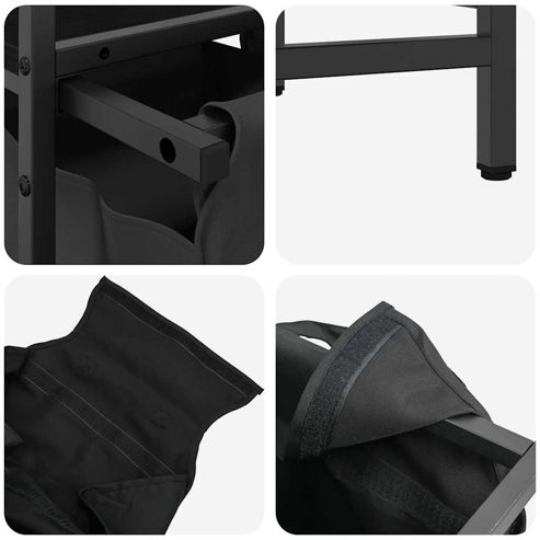 Der Wäschekorb bietet eine geräumige und praktische Aufbewahrungslösung mit herausziehbaren Beuteln, die das Ordnen Ihrer Wäsche mühelos machen. Wäschesortierer: Dieser Organizer bietet Platz für eine großzügige Wäscheladung pro Beutel und hilft dabei, Kleidungsstücke nach Farbe oder Stoffart zu sortieren, einen aufgeräumten Wäschebereich zu erhalten und auch Spielzeug und mehr aufzubewahren.Praktische herausziehbare Wäschebeutel: Die herausnehmbaren Wäschebeutel sind mit ausziehbaren Griffen und Klettverschlüssen zum einfachen Abnehmen und Herausziehen ausgestattet. Die verstärkten Bodenplatten helfen, die Form der Beutel zu erhalten und ein Durchhängen zu verhindern.Robuste und langlebige Struktur: Dieser Wäschekorb kombiniert einen Stahlrahmen mit langlebigem Holzwerkstoff und bietet so hervorragende Festigkeit, Verschleißfestigkeit und Stabilität.Obere Ablagefläche: Der Wäschekorb verfügt über zusätzliche Ablagen und bietet so eine praktische Lösung, um Ihre wichtigsten Dinge griffbereit zu haben. Perfekt zur Aufbewahrung von Toilettenartikeln, Waschmitteln, Weichspülern oder sogar Dekorationsartikeln.Vielseitig und multifunktional: Dieses Regal ist perfekt für die Waschküche, das Badezimmer oder das Schlafzimmer geeignet und verbindet nahtlos Funktionalität mit Stil. So bleibt Ihr Zuhause ordentlich und organisiert und passt gleichzeitig zu verschiedenen Einrichtungsstilen. Warnung:Um ein Umkippen zu verhindern, muss dieses Produkt mit der mitgelieferten Wandhalterung verwendet werden. ** Rahmenfarbe: Schwarz ** Regalfarbe: Schwarze Eiche ** Wäschesackfarbe: Schwarz ** Rahmenmaterial: Stahl ** Regalmaterial: Holzwerkstoff ** Wäschesackmaterial: Stoff (100 % Polyester) ** Gesamtmaße: 67 x 33 x 97 cm (B x T x H) ** Wäschesackmaße (jeweils): 29,5 x 29,5 x 52,5 cm (B x T x H) ** Maximale Gesamttragkraft: 40 kg ** Max. Tragkraft pro Regal: 20 kg ** Max. Tragkraft pro Wäschesack: 5 kg ** Jeder Wäschesack verfügt über eine Bodenplatte zur Stabilisierung ** Montage erforderlich: Ja ** Lieferumfang: ** 2 x Wäschesack ** 2 x Bodenplatte ** 2 x Regal ** Wäschekorbrahmen ** Montagezubehör