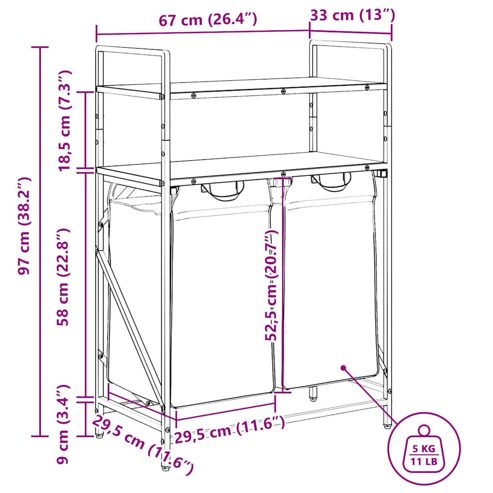 Der Wäschekorb bietet eine geräumige und praktische Aufbewahrungslösung mit herausziehbaren Beuteln, die das Ordnen Ihrer Wäsche mühelos machen. Wäschesortierer: Dieser Organizer bietet Platz für eine großzügige Wäscheladung pro Beutel und hilft dabei, Kleidungsstücke nach Farbe oder Stoffart zu sortieren, einen aufgeräumten Wäschebereich zu erhalten und auch Spielzeug und mehr aufzubewahren.Praktische herausziehbare Wäschebeutel: Die herausnehmbaren Wäschebeutel sind mit ausziehbaren Griffen und Klettverschlüssen zum einfachen Abnehmen und Herausziehen ausgestattet. Die verstärkten Bodenplatten helfen, die Form der Beutel zu erhalten und ein Durchhängen zu verhindern.Robuste und langlebige Struktur: Dieser Wäschekorb kombiniert einen Stahlrahmen mit langlebigem Holzwerkstoff und bietet so hervorragende Festigkeit, Verschleißfestigkeit und Stabilität.Obere Ablagefläche: Der Wäschekorb verfügt über zusätzliche Ablagen und bietet so eine praktische Lösung, um Ihre wichtigsten Dinge griffbereit zu haben. Perfekt zur Aufbewahrung von Toilettenartikeln, Waschmitteln, Weichspülern oder sogar Dekorationsartikeln.Vielseitig und multifunktional: Dieses Regal ist perfekt für die Waschküche, das Badezimmer oder das Schlafzimmer geeignet und verbindet nahtlos Funktionalität mit Stil. So bleibt Ihr Zuhause ordentlich und organisiert und passt gleichzeitig zu verschiedenen Einrichtungsstilen. Warnung:Um ein Umkippen zu verhindern, muss dieses Produkt mit der mitgelieferten Wandhalterung verwendet werden. ** Rahmenfarbe: Schwarz ** Regalfarbe: Räuchereiche ** Wäschesackfarbe: Schwarz ** Rahmenmaterial: Stahl ** Regalmaterial: Holzwerkstoff ** Wäschesackmaterial: Stoff (100 % Polyester) ** Gesamtmaße: 67 x 33 x 97 cm (B x T x H) ** Wäschesackmaße (jeweils): 29,5 x 29,5 x 52,5 cm (B x T x H) ** Maximale Gesamttragkraft: 40 kg ** Max. Tragkraft pro Regal: 20 kg ** Max. Tragkraft pro Wäschesack: 5 kg ** Jeder Wäschesack verfügt über eine Bodenplatte zur Stabilisierung ** Montage erforderlich: Ja ** Lieferumfang: ** 2 x Wäschesack ** 2 x Bodenplatte ** 2 x Regal ** Wäschekorbrahmen ** Montagezubehör