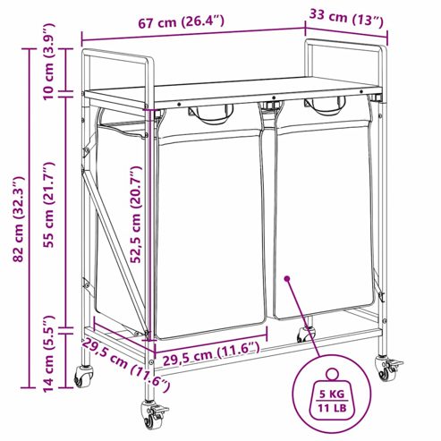 Der Wäschekorb bietet eine geräumige und praktische Aufbewahrungslösung mit ausziehbaren Wäschesäcken und Rollen, die das Ordnen und Transportieren Ihrer Wäsche mühelos machen. Wäschesortierer: Dieser Wäschesortierer bietet Platz für eine großzügige Wäscheladung pro Wäschesack und hilft, Kleidungsstücke nach Farbe oder Stoffart zu sortieren, für einen aufgeräumten Wäschebereich zu sorgen und auch Spielzeug und mehr aufzubewahren.Praktische ausziehbare Wäschesäcke: Die herausnehmbaren Wäschesäcke sind mit ausziehbaren Griffen und Klettverschlüssen zum einfachen Abnehmen und Herausziehen ausgestattet. Die verstärkten Bodenplatten helfen, die Form der Säcke zu erhalten und ein Durchhängen zu verhindern.Robuste und langlebige Struktur: Dieser Wäschekorb kombiniert einen Stahlrahmen mit langlebigem Holzwerkstoff und bietet so hervorragende Festigkeit, Verschleißfestigkeit und Stabilität.Obere Ablagefläche: Der Wäschekorb verfügt über ein oberes Regal und bietet so eine praktische Lösung, um Ihre wichtigsten Dinge griffbereit zu haben. Perfekt zur Aufbewahrung von Toilettenartikeln, Waschmitteln, Weichspülern oder sogar Dekorationsartikeln.Mühelose Mobilität: Dank robuster Räder lässt sich dieser Wäschekorb problemlos von Raum zu Raum rollen. Zwei der Räder sind mit Bremsen ausgestattet, sodass der Korb, sobald Sie ihn an der gewünschten Stelle platziert haben, sicher an seinem Platz bleibt und nicht wegrollt. ** Rahmenfarbe: Schwarz ** Regalfarbe: Räuchereiche ** Wäschesackfarbe: Schwarz ** Rahmenmaterial: Stahl ** Regalmaterial: Holzwerkstoff ** Wäschesackmaterial: Stoff (100 % Polyester) ** Gesamtmaße: 67 x 33 x 82 cm (B x T x H) ** Wäschesackmaße (jeweils): 29,5 x 29,5 x 52,5 cm (B x T x H) ** Maximale Gesamttragkraft: 40 kg ** Max. Tragkraft pro Regal: 20 kg ** Max. Tragkraft pro Wäschesack: 5 kg ** Mit vier Rädern (zwei mit Bremsen) ** Jeder Wäschesack verfügt über eine Bodenplatte für mehr Stabilität ** Zusammenbau erforderlich: Ja ** Lieferumfang: ** 2 x Wäschesack ** 2 x Bodenplatte ** 1 x Regal ** 4 x Räder ** Wäschekorbgestell ** Montagezubehör