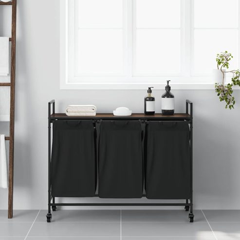 Der Wäschekorb bietet eine geräumige und praktische Aufbewahrungslösung mit ausziehbaren Wäschesäcken und Rollen, die das Ordnen und Transportieren Ihrer Wäsche mühelos machen. Wäschesortierer: Dieser Wäschesortierer bietet Platz für eine großzügige Wäscheladung pro Wäschesack und hilft, Kleidungsstücke nach Farbe oder Stoffart zu sortieren, für einen aufgeräumten Wäschebereich zu sorgen und auch Spielzeug und mehr aufzubewahren.Praktische ausziehbare Wäschesäcke: Die herausnehmbaren Wäschesäcke sind mit ausziehbaren Griffen und Klettverschlüssen zum einfachen Abnehmen und Herausziehen ausgestattet. Die verstärkten Bodenplatten helfen, die Form der Säcke zu erhalten und ein Durchhängen zu verhindern.Robuste und langlebige Struktur: Dieser Wäschekorb kombiniert einen Stahlrahmen mit langlebigem Holzwerkstoff und bietet so hervorragende Festigkeit, Verschleißfestigkeit und Stabilität.Obere Ablagefläche: Der Wäschekorb verfügt über ein oberes Regal und bietet so eine praktische Lösung, um Ihre wichtigsten Dinge griffbereit zu haben. Perfekt zur Aufbewahrung von Toilettenartikeln, Waschmitteln, Weichspülern oder sogar Dekorationsartikeln.Mühelose Mobilität: Dank robuster Räder lässt sich dieser Wäschekorb problemlos von Raum zu Raum rollen. Zwei der Räder sind mit Bremsen ausgestattet, sodass der Korb, sobald Sie ihn an der gewünschten Stelle platziert haben, sicher an seinem Platz bleibt und nicht wegrollt. ** Rahmenfarbe: Schwarz ** Regalfarbe: Brauneiche ** Wäschesackfarbe: Schwarz ** Rahmenmaterial: Stahl ** Regalmaterial: Holzwerkstoff ** Wäschesackmaterial: Stoff (100 % Polyester) ** Gesamtmaße: 99 x 33 x 82 cm (B x T x H) ** Wäschesackmaße (jeweils): 29,5 x 29,5 x 52,5 cm (B x T x H) ** Maximale Gesamttragkraft: 40 kg ** Max. Tragkraft pro Regal: 20 kg ** Max. Tragkraft pro Wäschesack: 5 kg ** Mit vier Rädern (zwei mit Bremsen) ** Jeder Wäschesack verfügt über eine Bodenplatte für mehr Stabilität ** Zusammenbau erforderlich: Ja ** Lieferumfang: ** 3 x Wäschesack ** 3 x Bodenplatte ** 1 x Regal ** 4 x Räder ** Wäschekorbgestell ** Montagezubehör