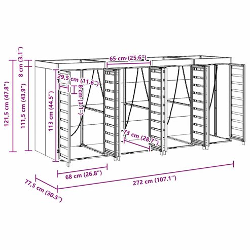 Die Mülltonnenaufbewahrung bietet eine schicke Lösung, um Abfallbehälter im Freien zu organisieren, ohne das Aussehen deines Gartens oder deiner Terrasse zu stören. Das moderne Design fügt sich perfekt in verschiedene Außenräume ein, und sie ist sowohl praktisch als auch gut aussehend. Für den Außeneinsatz gemacht, bleibt sie auch langfristig top in Schuss, während dein Raum ordentlich bleibt. Eine tolle Wahl für alle, die Wert auf Ordnung und Sauberkeit legen. Wasserabweisendes Material: Diese Mülltonnenaufbewahrung ist so gemacht, dass sie Regen und Sonne standhält, damit dein Müll trocken und sauber bleibt. Das UV-beständige Material sorgt dafür, dass die Farben und die Form auch bei jeder Witterung erhalten bleiben. Innovatives erweiterbares Design: Der Rahmen lässt sich wirklich ganz einfach anpassen, je nachdem, wie viele Mülltonnen du hast. Wenn du mehr Platz brauchst, kannst du ganz einfach andere Sektionen hinzufügen. Genial für wachsende Familien oder wenn du mehr Platz brauchst! Belüftetes Merkmal für Effizienz: Wegen der Belüftung bleibt die Luft gut zirkulieren, und das hilft, unangenehme Gerüche zu vermeiden. So bleibt alles hygienisch und angenehm, wenn du draußen bist. Stylisches modernes Design: Das moderne Design kombiniert einfache Linien mit Funktionalität. Es passt perfekt in jeden zeitgemäßen Garten oder jede Terrasse und macht alles noch schöner. Einfache Pflege & Wartung: Die Pflege ist ganz einfach; einfach mal mit einem feuchten Tuch drüberwischen, und schon sieht alles wieder neu aus. Mit diesem praktischen Zubehör wird alles noch einfacher und schöner für alle, die auf Nützlichkeit und schönes Aussehen Wert legen. ** Farbe: Anthrazit ** Material: Stahl ** Gesamtabmessungen: 272 x 77,5 x 121,5 cm (B x T x H) ** Erweiterbar ** Belüftetes Design ** Geeignet für Standardmülltonnen mit einem Volumen von 120 L oder 240 L ** Magnettüren ** Pflanzdach mit Ablauföffnungen ** Innendimensionen (jeweils): 65 x 73 x 113 cm (B x T x H) ** Innen- / Außenbereich: Nur für den Außenbereich ** Lieferumfang: ** 1 x Rollcontainer Aufbewahrung ** Montage erforderlich: Ja