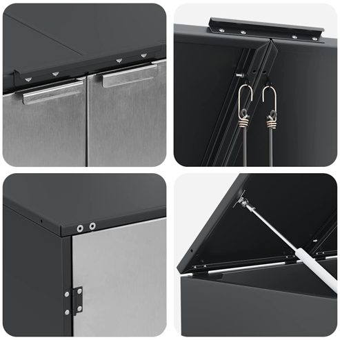 Die Mülltonnenaufbewahrung bietet eine schicke Lösung, um Abfallbehälter im Freien zu organisieren, ohne das Aussehen deines Gartens oder deiner Terrasse zu stören. Das moderne Design fügt sich perfekt in verschiedene Außenräume ein, und sie ist sowohl praktisch als auch gut aussehend. Für den Außeneinsatz gemacht, bleibt sie auch langfristig top in Schuss, während dein Raum ordentlich bleibt. Eine tolle Wahl für alle, die Wert auf Ordnung und Sauberkeit legen. Wasserabweisendes Material: Diese Mülltonnenaufbewahrung ist so gemacht, dass sie Regen und Sonne standhält, damit dein Müll trocken und sauber bleibt. Das UV-beständige Material sorgt dafür, dass die Farben und die Form auch bei jeder Witterung erhalten bleiben. Innovatives erweiterbares Design: Der Rahmen lässt sich wirklich ganz einfach anpassen, je nachdem, wie viele Mülltonnen du hast. Wenn du mehr Platz brauchst, kannst du ganz einfach andere Sektionen hinzufügen. Genial für wachsende Familien oder wenn du mehr Platz brauchst! Belüftetes Merkmal für Effizienz: Wegen der Belüftung bleibt die Luft gut zirkulieren, und das hilft, unangenehme Gerüche zu vermeiden. So bleibt alles hygienisch und angenehm, wenn du draußen bist. Stylisches modernes Design: Das moderne Design kombiniert einfache Linien mit Funktionalität. Es passt perfekt in jeden zeitgemäßen Garten oder jede Terrasse und macht alles noch schöner. Einfache Pflege & Wartung: Die Pflege ist ganz einfach; einfach mal mit einem feuchten Tuch drüberwischen, und schon sieht alles wieder neu aus. Mit diesem praktischen Zubehör wird alles noch einfacher und schöner für alle, die auf Nützlichkeit und schönes Aussehen Wert legen. ** Farbe: Anthrazit ** Material: Stahl ** Gesamtabmessungen: 340 x 77,5 x 115,5 cm (B x T x H) ** Erweiterbar ** Belüftetes Design ** Geeignet für Standardmülltonnen mit einem Volumen von 120 L oder 240 L ** Magnettüren ** Gasdruckdeckel mit einem Bungee-Seil ** Innendimensionen (jeweils): 65 x 73 x 113 cm (B x T x H) ** Innen- / Außenbereich: Nur für den Außenbereich ** Lieferumfang: ** 1 x Rollcontainer Aufbewahrung ** Montage erforderlich: Ja