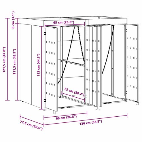 Die Mülltonnenaufbewahrung bietet eine schicke Lösung, um Abfallbehälter im Freien zu organisieren, ohne das Aussehen deines Gartens oder deiner Terrasse zu stören. Das moderne Design fügt sich perfekt in verschiedene Außenräume ein, und sie ist sowohl praktisch als auch gut aussehend. Für den Außeneinsatz gemacht, bleibt sie auch langfristig top in Schuss, während dein Raum ordentlich bleibt. Eine tolle Wahl für alle, die Wert auf Ordnung und Sauberkeit legen. Wasserabweisendes Material: Diese Mülltonnenaufbewahrung ist so gemacht, dass sie Regen und Sonne standhält, damit dein Müll trocken und sauber bleibt. Das UV-beständige Material sorgt dafür, dass die Farben und die Form auch bei jeder Witterung erhalten bleiben. Innovatives erweiterbares Design: Der Rahmen lässt sich wirklich ganz einfach anpassen, je nachdem, wie viele Mülltonnen du hast. Wenn du mehr Platz brauchst, kannst du ganz einfach andere Sektionen hinzufügen. Genial für wachsende Familien oder wenn du mehr Platz brauchst! Belüftetes Merkmal für Effizienz: Wegen der Belüftung bleibt die Luft gut zirkulieren, und das hilft, unangenehme Gerüche zu vermeiden. So bleibt alles hygienisch und angenehm, wenn du draußen bist. Stylisches modernes Design: Das moderne Design kombiniert einfache Linien mit Funktionalität. Es passt perfekt in jeden zeitgemäßen Garten oder jede Terrasse und macht alles noch schöner. Einfache Pflege & Wartung: Die Pflege ist ganz einfach; einfach mal mit einem feuchten Tuch drüberwischen, und schon sieht alles wieder neu aus. Mit diesem praktischen Zubehör wird alles noch einfacher und schöner für alle, die auf Nützlichkeit und schönes Aussehen Wert legen. ** Farbe: Anthrazit ** Material: Stahl ** Gesamtabmessungen: 136 x 77,5 x 121,5 cm (B x T x H) ** Erweiterbar ** Belüftetes Design ** Geeignet für Standardmülltonnen mit einem Volumen von 120 L oder 240 L ** Magnettüren ** Pflanzdach mit Ablauföffnungen ** Innendimensionen (jeweils): 65 x 73 x 113 cm (B x T x H) ** Innen- / Außenbereich: Nur für den Außenbereich ** Lieferumfang: ** 1 x Rollcontainer Aufbewahrung ** Montage erforderlich: Ja