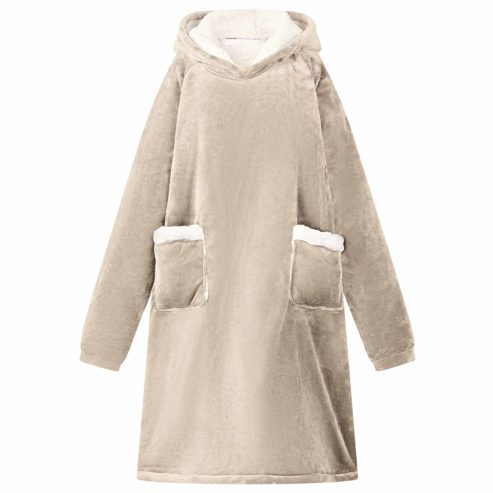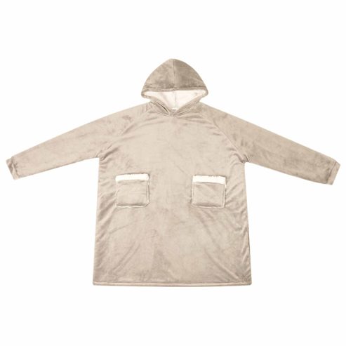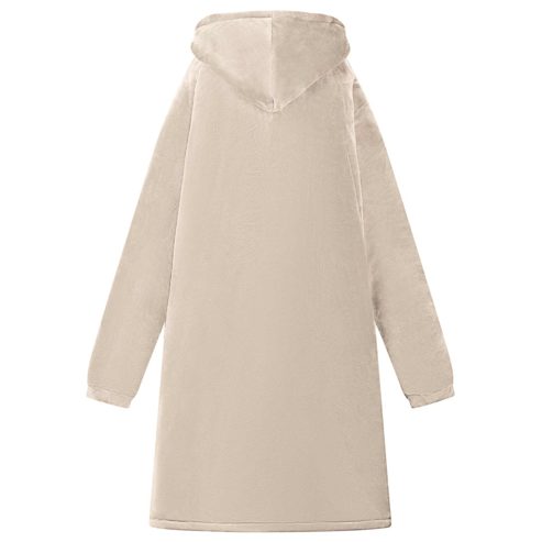 Dieser weiche Decken-Hoodie ist der Inbegriff von gemütlicher Wintermode, perfekt für entspannte Stunden drinnen in der kühlen Jahreszeit. Das oversized Design aus einer luxuriösen Fleece-Flanell-Mischung gibt dir eine sanfte Umarmung. Seine durchdachte Passform macht ihn ideal, um einen gemütlichen Abend auf der Couch zu verbringen, friedlich im Wohnzimmer zu lesen oder sogar als praktisches Kleidungsstück im Schlafzimmer. Material mit weicher Berührung: Dieser Decken-Hoodie aus einer kuscheligen Mischung aus Fleece und Flanell fühlt sich fantastisch auf der Haut an und bietet hohes Maß an Komfort. Der Stoff hält dich warm, ohne schwer zu sein, und sorgt für ein leichtes Gefühl, das beim Entspannen drinnen im Winter einfach klasse ist. Extra warme Kapuze: Die Kapuze bietet Wärme und Schutz für Kopf und Nacken. Ob beim Schlürfen eines heißen Getränks oder beim Lesen eines Buches, die Kapuze garantiert kuschelige Wärme und hüllt dich von Kopf bis Fuß ein. Praktische Tasche: Die Tasche ist super platziert und ermöglicht einfachen Zugriff auf dein Handy oder die Fernbedienung, ohne dass du deinen gemütlichen Platz verlassen musst. So wird der Hoodie noch funktionaler und sorgt für Komfort in deinen Entspannungsmomenten. Tragbares Design: Leicht und einfach zu transportieren, begleitet dich der Decken-Hoodie von Raum zu Raum und spendet dir überall Wärme. Beweg dich mühelos, während du das durchgehende warm und kuschelige Feeling genießen kannst. Einfache Pflege: Die Pflege deines Hoodies ist kinderleicht. Vermeide aggressive Chemikalien und Abrasive beim Waschen, damit der Stoff weich und lebendig bleibt. So kannst du seine Wärme ohne Sorgen genießen. ** Farbe: Beige ** Material: Fleece und Flanell ** Gesamtabmessungen: 112 x 94 cm (L x B) ** Gewicht: 1,43 kg ** Leichtes Gewicht ** Tragbar ** Langlebig ** Praktische Taschen ** Extra-warmer Kapuze ** Einfache Pflege ** Innen- / Außenbereich: Nur für den Innenbereich ** Lieferumfang: ** 1 x Decken-Hoodie