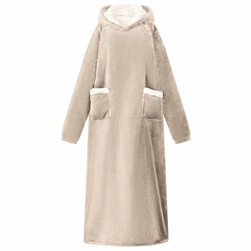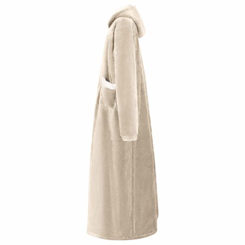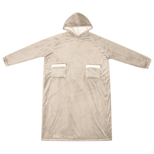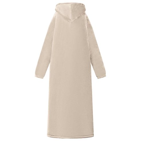 Dieser weiche Decken-Hoodie ist der Inbegriff von gemütlicher Wintermode, perfekt für entspannte Stunden drinnen in der kühlen Jahreszeit. Das oversized Design aus einer luxuriösen Fleece-Flanell-Mischung gibt dir eine sanfte Umarmung. Seine durchdachte Passform macht ihn ideal, um einen gemütlichen Abend auf der Couch zu verbringen, friedlich im Wohnzimmer zu lesen oder sogar als praktisches Kleidungsstück im Schlafzimmer. Material mit weicher Berührung: Dieser Decken-Hoodie aus einer kuscheligen Mischung aus Fleece und Flanell fühlt sich fantastisch auf der Haut an und bietet hohes Maß an Komfort. Der Stoff hält dich warm, ohne schwer zu sein, und sorgt für ein leichtes Gefühl, das beim Entspannen drinnen im Winter einfach klasse ist. Extra warme Kapuze: Die Kapuze bietet Wärme und Schutz für Kopf und Nacken. Ob beim Schlürfen eines heißen Getränks oder beim Lesen eines Buches, die Kapuze garantiert kuschelige Wärme und hüllt dich von Kopf bis Fuß ein. Praktische Tasche: Die Tasche ist super platziert und ermöglicht einfachen Zugriff auf dein Handy oder die Fernbedienung, ohne dass du deinen gemütlichen Platz verlassen musst. So wird der Hoodie noch funktionaler und sorgt für Komfort in deinen Entspannungsmomenten. Tragbares Design: Leicht und einfach zu transportieren, begleitet dich der Decken-Hoodie von Raum zu Raum und spendet dir überall Wärme. Beweg dich mühelos, während du das durchgehende warm und kuschelige Feeling genießen kannst. Einfache Pflege: Die Pflege deines Hoodies ist kinderleicht. Vermeide aggressive Chemikalien und Abrasive beim Waschen, damit der Stoff weich und lebendig bleibt. So kannst du seine Wärme ohne Sorgen genießen. ** Farbe: Beige ** Material: Fleece und Flanell ** Gesamtabmessungen: 150 x 87 cm (L x B) ** Gewicht: 1,85 kg ** Leichtes Gewicht ** Tragbar ** Langlebig ** Praktische Taschen ** Extra-warmer Kapuze ** Einfache Pflege ** Innen- / Außenbereich: Nur für den Innenbereich ** Lieferumfang: ** 1 x Decken-Hoodie