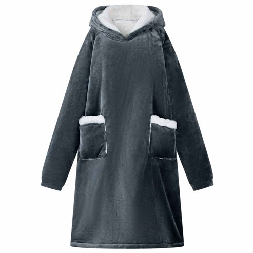 Dieser weiche Decken-Hoodie ist der Inbegriff von gemütlicher Wintermode, perfekt für entspannte Stunden drinnen in der kühlen Jahreszeit. Das oversized Design aus einer luxuriösen Fleece-Flanell-Mischung gibt dir eine sanfte Umarmung. Seine durchdachte Passform macht ihn ideal, um einen gemütlichen Abend auf der Couch zu verbringen, friedlich im Wohnzimmer zu lesen oder sogar als praktisches Kleidungsstück im Schlafzimmer. Material mit weicher Berührung: Dieser Decken-Hoodie aus einer kuscheligen Mischung aus Fleece und Flanell fühlt sich fantastisch auf der Haut an und bietet hohes Maß an Komfort. Der Stoff hält dich warm, ohne schwer zu sein, und sorgt für ein leichtes Gefühl, das beim Entspannen drinnen im Winter einfach klasse ist. Extra warme Kapuze: Die Kapuze bietet Wärme und Schutz für Kopf und Nacken. Ob beim Schlürfen eines heißen Getränks oder beim Lesen eines Buches, die Kapuze garantiert kuschelige Wärme und hüllt dich von Kopf bis Fuß ein. Praktische Tasche: Die Tasche ist super platziert und ermöglicht einfachen Zugriff auf dein Handy oder die Fernbedienung, ohne dass du deinen gemütlichen Platz verlassen musst. So wird der Hoodie noch funktionaler und sorgt für Komfort in deinen Entspannungsmomenten. Tragbares Design: Leicht und einfach zu transportieren, begleitet dich der Decken-Hoodie von Raum zu Raum und spendet dir überall Wärme. Beweg dich mühelos, während du das durchgehende warm und kuschelige Feeling genießen kannst. Einfache Pflege: Die Pflege deines Hoodies ist kinderleicht. Vermeide aggressive Chemikalien und Abrasive beim Waschen, damit der Stoff weich und lebendig bleibt. So kannst du seine Wärme ohne Sorgen genießen. ** Farbe: Marineblau ** Material: Fleece und Flanell ** Gesamtabmessungen: 112 x 94 cm (L x B) ** Gewicht: 1,43 kg ** Leichtes Gewicht ** Tragbar ** Langlebig ** Praktische Taschen ** Extra-warmer Kapuze ** Einfache Pflege ** Innen- / Außenbereich: Nur für den Innenbereich ** Lieferumfang: ** 1 x Decken-Hoodie