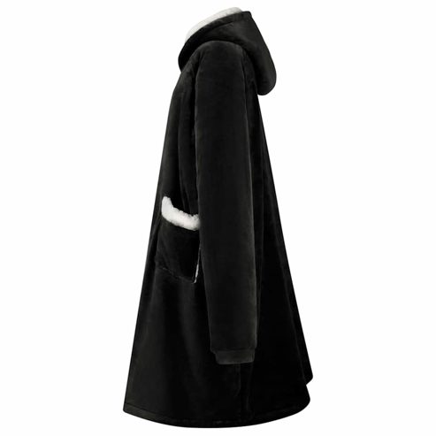 Dieser weiche Decken-Hoodie ist der Inbegriff von gemütlicher Wintermode, perfekt für entspannte Stunden drinnen in der kühlen Jahreszeit. Das oversized Design aus einer luxuriösen Fleece-Flanell-Mischung gibt dir eine sanfte Umarmung. Seine durchdachte Passform macht ihn ideal, um einen gemütlichen Abend auf der Couch zu verbringen, friedlich im Wohnzimmer zu lesen oder sogar als praktisches Kleidungsstück im Schlafzimmer. Material mit weicher Berührung: Dieser Decken-Hoodie aus einer kuscheligen Mischung aus Fleece und Flanell fühlt sich fantastisch auf der Haut an und bietet hohes Maß an Komfort. Der Stoff hält dich warm, ohne schwer zu sein, und sorgt für ein leichtes Gefühl, das beim Entspannen drinnen im Winter einfach klasse ist. Extra warme Kapuze: Die Kapuze bietet Wärme und Schutz für Kopf und Nacken. Ob beim Schlürfen eines heißen Getränks oder beim Lesen eines Buches, die Kapuze garantiert kuschelige Wärme und hüllt dich von Kopf bis Fuß ein. Praktische Tasche: Die Tasche ist super platziert und ermöglicht einfachen Zugriff auf dein Handy oder die Fernbedienung, ohne dass du deinen gemütlichen Platz verlassen musst. So wird der Hoodie noch funktionaler und sorgt für Komfort in deinen Entspannungsmomenten. Tragbares Design: Leicht und einfach zu transportieren, begleitet dich der Decken-Hoodie von Raum zu Raum und spendet dir überall Wärme. Beweg dich mühelos, während du das durchgehende warm und kuschelige Feeling genießen kannst. Einfache Pflege: Die Pflege deines Hoodies ist kinderleicht. Vermeide aggressive Chemikalien und Abrasive beim Waschen, damit der Stoff weich und lebendig bleibt. So kannst du seine Wärme ohne Sorgen genießen. ** Farbe: Schwarz ** Material: Fleece und Flanell ** Gesamtabmessungen: 112 x 94 cm (L x B) ** Gewicht: 1,43 kg ** Leichtes Gewicht ** Tragbar ** Langlebig ** Praktische Taschen ** Extra-warmer Kapuze ** Einfache Pflege ** Innen- / Außenbereich: Nur für den Innenbereich ** Lieferumfang: ** 1 x Decken-Hoodie