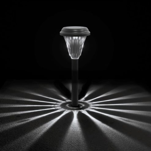 Diese Solar-Wegeleuchten beleuchten nicht nur Gehwege und Einfahrten, sondern werten auch die Ästhetik deines Outdoor-Bereichs auf. Solarbetrieben und automatische Ein-/Aus-Schaltung: Diese Gartenleuchte verfügt über ein Solarpanel auf der Oberseite, das tagsüber Sonnenlicht absorbiert und den integrierten Akku auflädt. Darüber hinaus hat die Außenleuchte eingebaute Sensoren, die das Licht in der Abenddämmerung automatisch ein- bzw. in der Morgendämmerung ausschalten und so für eine bequeme und energieeffiziente Außenbeleuchtung sorgen.Witterungsbeständig: Diese Außenbeleuchtung ist nach IP44 wasserfest und bietet so Schutz vor Regen, Schnee, Frost und Schmutz, sodass sie für den ganzjährigen Einsatz im Freien bei unterschiedlichen Wetterbedingungen nutzen kannst.Einfach Montage: Die Installation ist ein Kinderspiel — keine Verkabelung erforderlich. Schließe einfach die Teile an und stecke den Erdspieß in den Boden, da wo die Sonne scheint.Breiter Anwendungsbereich: Diese Solar-Gartenleuchte projiziert wunderschöne Muster auf die Umgebung: Garten, Innenhof, Rasen, Einfahrt und Gehwege. Die Outdoor-Leuchte sorgt für eine attraktive Beleuchtung und eine romantische Atmosphäre in deinem Außenbereich. Gut zu wissen:Damit die Solarleuchte die ganze Nacht hindurch leuchtet, stelle sie an einem Ort mit reichlich Sonnenlicht auf.Stelle sicher, dass du den Schalter auf ON stellst, damit sich die Gartenleuchte aufladen kann.Bevor du den Erdspieß in den Boden steckst, lockere ihn mit einer Schaufel auf oder grabe ein Loch, um das Einführen des Erdspießes zu erleichtern. ** Farbe: Schwarz und Transparent ** Material: PS (Polystyrol), PP-Kunststoff ** Gesamtabmessungen: 8,5 x 31 cm (Durchmesser x H) ** Erdspieß-Länge: 19,5 cm ** Lichtmodi: Weiß ** EIN-/AUS-Schalter ** Stromquelle: Sonnenenergie ** Solarmodul: 2V / 150mAh ** Batterie: 1 x AAA NI-MH wiederaufladbare Batterie, 1,2 V/100 mAh (im Lieferumfang enthalten) ** Ladezeit: 6 - 8 h ** Leuchtdauer: 8 h ** Leuchtmittel-Typ: Weiße LED ** Anzahl LED: 1 ** Schutzart: IP44 ** Zusammenbau erforderlich: Ja ** ** Lieferung umfasst: ** 12 x Solar-Wegeleuchte mit Erdspieß Dieses Produkt darf in der Europäischen Union nicht zusammen mit anderem Hausmüll entsorgt werden.