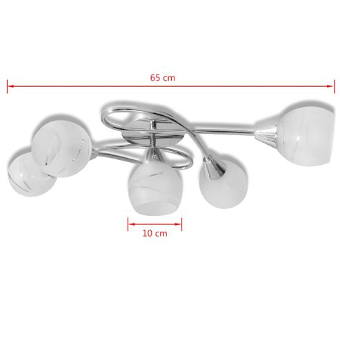 Diese einzigartige Deckenleuchte hat 5 sphärische Glasschirme. Die Lampe wird eine tolle Beleuchtung in Ihrem Wohnzimmer oder Schlafzimmer erzeugen. Der Metall-Look der Lampe verleiht ihr einen modernen Stil. Diese Lampe kann problemlos an jede Decke montiert werden. Diese Lampe ist für fünf E14 Leuchtmittel ausgelegt. Glühbirnen sind im Lieferumfang nicht enthalten! ** Material: Eisenrahmen + Glasschirme ** Gesamtgröße: 65 x 35 x 20 cm (L x B x H) ** Lampenschirm Durchmesser: 10 cm ** Spannung: 220 V ** Max. Leistung: 5 x 40 W ** Socket-Typ: E14 ** Chrom Finish ** Glühbirnen sind nicht im Lieferumfang enthalten ** Die Montage ist sehr einfach