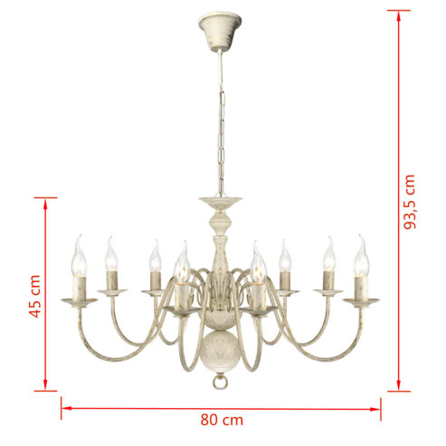 Dieser tolle Kronleuchter hat ein klassiches und elegantes Design und wird ein echter Blickfang in Ihrem Raum sein! Er eignet sich für Wohnhäuser und gewerbliche Nutzung. Das hochwertige Metallgestell der Deckenlampe ist sehr langlebig und kann leicht an der Decke befestigt werden. Mit diesem Kronleuchter im Vintage-Design können Sie Ihrer Einrichtung einen luxuriösen Touch verleihen. Der Lieferumfang umfasst 1 Deckenlampe. ** Lampengröße: 80 x 45 cm (Φ x H) ** Gesamthöhe: 93,5 cm ** Spannung: 230 V~ ** Frequenz: 50 Hz ** Glühlampenleistung: Max. 40 W ** Lampenfassung: 8 x E14 ** Material: Metall ** Farbe: Antik-Weiß ** Vintage-Design ** Lieferumfang umfasst 1 x Lampe (Leuchtmittel sind nicht im Lieferumfang enthalten) Dieses Gerät ist nicht dafür bestimmt, von Personen (einschließlich Kindern) mit eingeschränkten physischen, sensorischen oder geistigen Fähigkeiten oder mangelnder Erfahrung und mangelndem Wissen benutzt zu werden, es sei denn, sie werden von einer für ihre Sicherheit verantwortlichen Person beaufsichtigt oder in der Benutzung des Geräts unterwiesen. Dieses Produkt ist kein Spielzeug. Erlaube Kindern nicht, mit dem Gerät zu spielen.