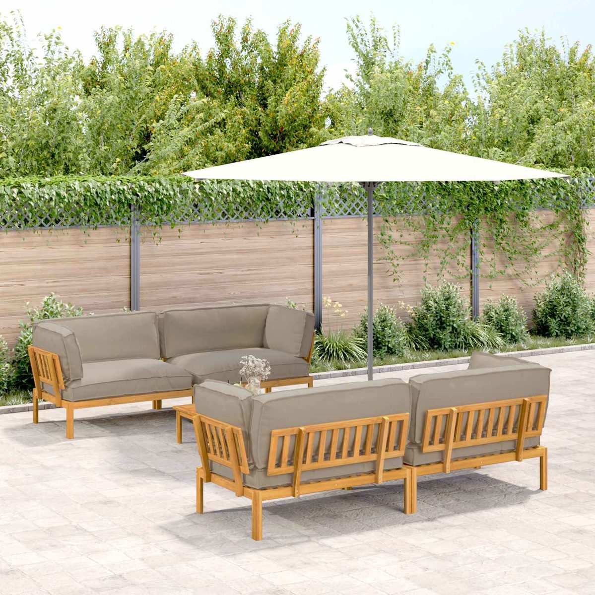 Dieses Lounge-Sofa-Set aus Holz ist eine top Sitzlösung für draußen. Sein modernes Design schafft eine einladende Atmosphäre, egal ob im Garten oder auf der Terrasse. Die modularen Elemente bieten Flexibilität und Komfort, perfekt für die verschiedenen Möglichkeiten Outdoor. Der stilvolle Look in warmen Brauntönen vom massiven Akazienholz bringt jeden Bereich zum Strahlen, wenn du Chillen oder Gäste bewirten willst. Massives akazienholz Das Sofa-Set nutzt robustes Akazienholz für lange Haltbarkeit und einen warmen Farbton. Mit einem geölten Finish behandelt, hält es Feuchtigkeit ab und hebt die natürliche Farbe hervor, ideal für den dauerhaften Einsatz im Freien. Modulares Design Jedes Element wurde modular konzipiert, sodass du verschiedene Aufstellungen für deinen Außenbereich und deine Sitzbedürfnisse gestalten kannst. Das macht es einfach, dein Setup zu ändern, wenn sich dein Lebensstil ändert. Wetterfeste Polsterung Das Set hat Outdoor-Kissen aus Oxford-Stoff, die super gegen Witterungseinflüsse beständig sind. Das sorgt für dauerhaften Komfort bei jedem Wetter und macht sie perfekt für langfristigen Einsatz draußen. Eleganter moderner Stil Mit klaren Linien und minimalistischem Design ist das Set ein Beispiel für modernes Design. Die Schlichtheit und Funktionalität passen zu vielen Outdoor-Stilen und schaffen einen harmonischen Look für deinen Garten oder deine Terrasse. Pflege & Wartung Halte das Sofa-Set in Topform, indem du es mit einem trockenen Tuch abwischst und eine Abdeckung verwendest, wenn es nicht gebraucht wird. Vermeide direkte Sonneneinstrahlung und aggressive Chemikalien, um die Lebensdauer zu verlängern und die Leistung zu sichern. ** Farbe: Taupe ** Material: Massivholz Akazie ** Oberfläche: Geölt ** Gesamtabmessungen: 266 x 92 x 69 cm (L x B x H) ** Gewicht: 41,9 kg ** Modular ** Sitzbereich: 120 x 80 cm (B x T) ** Max. Gewicht: 880 kg ** Nur für den Außenbereich ** Lieferumfang: ** 4 x Ecke Sofa: 133 x 92 x 69 cm (LxBxH) ** 1 x Tisch: 100 x 60 x 30 cm (LxBxH) ** 4 x Sitzkissen: 120 x 80 x 12 cm (LxBxH) ** 4 x Rückenkissen: 120 x 40 x 12 cm (LxBxH) ** 4 x Rückenkissen: 70 x 40 x 12 cm (LxBxH) ** Montage erforderlich: Ja Maximal 110 kg pro Sitzplatz.