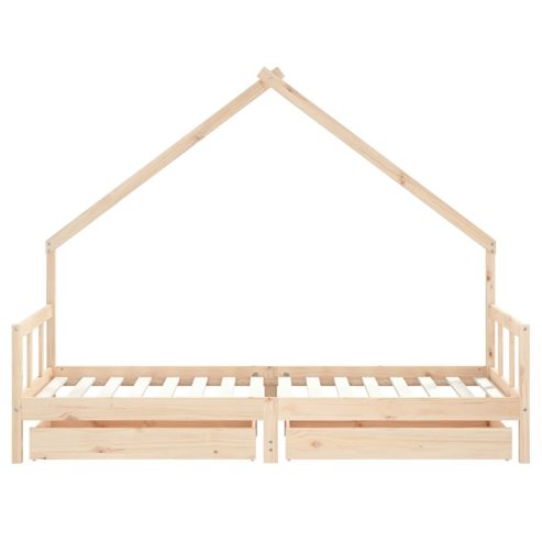 Mit diesem fantastischen Kinderbett aus Holz bietest du deinen Kleinen einen eigenen lustigen Platz! Massives Kiefernholz: Das Kinderbett ist aus massivem Kiefernholz gefertigt. Massives Kiefernholz ist ein wunderschönes Naturmaterial. Kiefernholz weist eine gerade Maserung auf und die Aststellen verleihen dem Material seine charakteristische, rustikale Optik.Robuste Latten: Das Kinderbett ist mit Holzlatten versehen, die für einen festen Halt, Belüftung und Stabilität sorgen.Design in Hausform: Mit seinem coolen und doch schlichten Design macht dieses Kleinkinderbett das Schlafengehen zu einem lustigen Erlebnis. Es bietet viele Möglichkeiten zum Spielen und Aufbauen einer kleinen Kinderwelt, um Kreativität und Fantasie anzuregen.Mit Schubladen: Die mitgelieferten Schubladen bieten reichlich Platz für die Aufbewahrung von Kleinspielzeug, Kleidung und Bettzeug, um für Ordnung im Kinderzimmer zu sorgen.Durchdachtes Design: Dank der geringen Höhe des Einzelbettes können Kinder leicht ins Bett ein- und aussteigen. ** Material: Massives Kiefernholz (unbehandelt) ** Gesamtabmessungen: 205,5 x 95,5 x 163,5 cm (L x B x H) ** Geeignete Matratzengröße: 90 x 200 cm (B x L) (Matratze ist nicht im Lieferumfang enthalten) ** Abmessungen der Schublade (pro Stück): 90 x 49 x 12,5 cm (B x T x H) ** Geeignet für Kinder ab 4 Jahren ** Zusammenbau erforderlich: Ja WARNUNG! Stelle dieses Kinderbett nicht in der Nähe von Wärmequellen, Fenstern und anderen Möbeln auf. WARNUNG! Benutze dieses Kinderbett nicht, wenn ein Teil kaputt ist, gerissen ist oder fehlt.