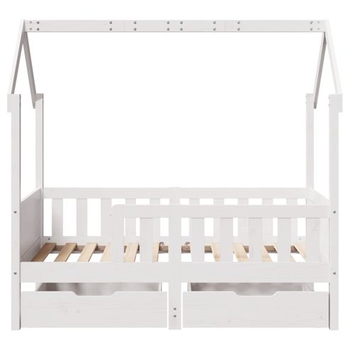 Dieses fantastische Hausbett aus Holz wird das Lieblingsbett deines Kindes sein, egal ob es gerade von seinem nächsten Abenteuer träumt oder in den Schlaf fällt. Stabiles und langlebiges Gestell: Massives Kiefernholz ist für seine Stärke und Haltbarkeit bekannt. Seine gerade Maserung und die charakteristischen Aststellen tragen zu seinem rustikalen Charme bei.Verspieltes Haus-Design: Dieses verspielte, von einem Haus inspirierte Kinderbett verwandelt die Schlafenszeit in ein tolles Abenteuer für die Kleinen. Es bietet ein gemütliches Plätzchen für die Schlafenszeit und einen spielerischen Bereich für fantasievolle Spiele.Schienen für mehr Sicherheit: Dieses Bettgestell ist mit Seitengittern ausgestattet, die verhindern, dass Kinder im Schlaf aus dem Bett fallen.Offenes Dach zum Selbermachen: Die offene Dachstruktur bietet unendliche Gestaltungsmöglichkeiten, so dass die Kinder leicht Dekorationen aufhängen oder ein Spielzelt anbringen können, um einen wirklich magischen und persönlichen Raum zu schaffen.Geräumiger Stauraum unter dem Bett: Dieser Bettrahmen bietet ausreichend Platz darunter, z.B. für Aufbewahrungsboxen, Körbe, Schubladen und mehr.Leichtgängig: Dank der vier Rollen lässt sich die Unterbettschublade mühelos hineinschieben und herausziehen. Gut zu wissen:Bei diesem Bett ist keine Matratze im Lieferumfang enthalten. Wir bieten jedoch eine große Auswahl an Matratzen an. Du kannst in unserem Shop nach einer passenden Matratze suchen. ** Farbe: Weiß ** Material: Massives Kiefernholz ** Zusammenbau erforderlich: Ja ** Bett: ** Material der Latten: Sperrholz ** Gesamtabmessungen: 169 x 85,5 x 146 cm (L x B x H) ** Höhe unter dem Bett: 21 cm ** Geeignete Matratzengröße: 80 x 160 cm (B x L) (Matratze nicht im Lieferumfang enthalten) ** Max. Belastbarkeit (mit Matratze): 100 kg ** Empfohlenes Alter: 4 Jahre und älter ** Mit Lattenrost ** Schublade: ** Außenmaße: 75 x 55 x 17 cm (B x T x H) ** Innenmaße: 66,5 x 52,5 x 10 cm (B x T x H) ** Max. Belastbarkeit (pro Stück): 20 kg ** Mit vier Rädern ** Lieferung umfasst: ** 1 x Bettrahmen ** 2 x Schublade