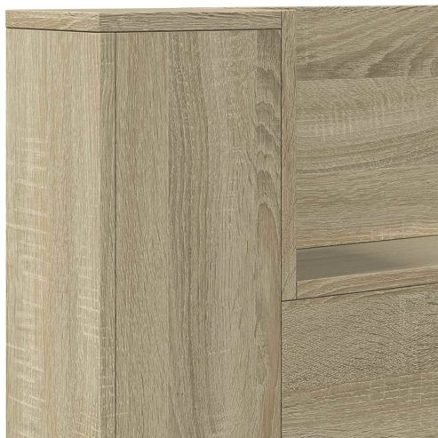 Mit dem modernen Kopfteil-Schränkchen mit LED-Leuchten wird Schlafzimmerdesign komplett neu interpretiert. Funktionaler Stauraum und stimmungsvolle Beleuchtung kommen in einem schlanken, minimalistischen Stil zusammen. Dieses Kopfteil wurde für moderne Räume entworfen und bietet Platz für Bücher und Deko und sorgt dabei mit anpassbarer LED-Beleuchtung für die richtige Atmosphäre. Es ist ein eleganter Eyecatcher und passt perfekt in moderne Innenräume, wo Stil und Funktionalität Hand in Hand gehen. Konstruktion aus Holzwerkstoff Das Kopfteil-Schränkchen ist aus Holzwerkstoff, der eine glatte und elegante Oberfläche bietet, die gleichzeitig haltbar ist. So behält der Schrank auch nach langer Nutzung seine Form und seinen schlichten, schicken Charme, der zu jeder modernen Deko passt. Integrierte LED-Streifenlichter Die LED-Streifenlichter in diesem Kopfteil bieten viele Beleuchtungsoptionen und die mehrfarbigen LEDs können ganz einfach mit einer Fernbedienung gesteuert werden. Du kannst eine entspannende oder lesefreundliche Atmosphäre schaffen und die Stimmung im Schlafzimmer ganz leicht ändern. Funktionale Regalfläche Die Regalbretter sind praktisch gestaltet und bieten Platz für Bücher und Deko, so wird der Bereich hinter dem Kopfteil leicht personalisierbar. Die praktische Anordnung nutzt den Platz optimal und hält alles stets griffbereit. Anpassbare Beleuchtungsoptionen Die LED-Beleuchtung lässt sich in verschiedenen Farben und Helligkeiten einstellen, sodass du die Beleuchtung nach deinem Geschmack anpassen kannst. So kannst du deinem Schlafzimmer einen persönlichen Touch verleihen und die Stimmung jederzeit ändern. Pflegehinweise Um die Oberfläche in gutem Zustand zu halten, einfach mit einem trockenen Tuch abwischen. Vermeide scharfe Chemikalien oder Schleifmittel, um das Finish des Materials zu schützen und die Lebensdauer des Produkts zu verlängern. ** Farbe: Sonoma ** Material: Holzwerkstoff ** Gesamtabmessungen: 160 x 16,5 x 103,5 cm (L x B x H) ** Wandbefestigung ** Fächer für Bücher und Deko ** Integrierte anpassbare RGB LED-Beleuchtung ** Montage erforderlich: Ja ** Lieferumfang: ** 1 x Kopfteilschrank mit LED ** 1 x Set von монтажzubehör