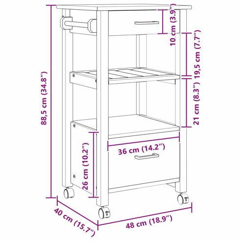 Der moderne Küchenwagen ist die perfekte Ergänzung für jede schicke Küche! Sein elegantes schwarzes Finish und die glatte Oberfläche verbessern die Funktionalität. Er bietet tollen Stauraum und ist beweglich, ohne dabei den Stil zu verlieren. Super für Utensilien, Kochgeschirr oder als praktische Insel bei der Essensvorbereitung! Materialien: Aus massiven Kiefernholz gefertigt, ist der Wagen stabil und elegant. Die natürliche Holzmaserung bringt Wärme, das Material ist robust und hält lange. Außerdem sorgen strapazierfähige Kunststoffelemente für eine harmonische Kombination in der modernen Küche. Inklusive Komponenten: Der Küchenwagen hat geräumige Schubladen und Fächer mit viel Platz für Besteck, Gewürze und kleine Geräte. Die Regale halten alles griffbereit und unterstützen dich, eine aufgeräumte Küche zu genießen. Merkmale/Funktion/Design: Neben dem stylischen Look ist der Wagen extrem funktional. Mit Rollen ausgestattet, lässt er sich einfach bewegen und passt sich deinem Kochstil an. So hast du alles immer zur Hand, ganz gleich wo du bist. Perfekt für verschiedene Küchen und Bedürfnisse! Empfohlene Anwendungen: Sein flexibles Design macht den Wagen perfekt für große und kleine Küchen. Du kannst ihn als Arbeitsfläche beim Kochen nutzen oder als Servierwagen für Partys. Einfach zu bewegen, verwandelt er jeden Raum schnell! Pflege und Wartung: Halte seinen coolen Look einfach mit ein bisschen Reinigung in Schuss. Nimm warmes Wasser und keine kräftigen Chemikalien, um den Glanz zu bewahren. Der Aufbau mit einem Schraubendreher nach Anleitung sorgt dafür, dass er super funktioniert. Regelmäßige Wartung macht ihn immer bereit für die Küche. ** Farbe: Schwarz ** Oberfläche: Sonstige ** Gesamtabmessungen: 48 x 40 x 88,5 cm (L x B x H) ** Stauraum ** Schubladen ** Rollbar ** Nur für den Innenbereich
