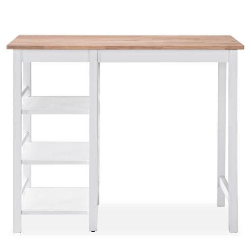 Dieses Bar-Set besteht aus einem Tisch und zwei Hockern und hat ein klassisches Design, das es zu einer großartigen Ergänzung für Ihr Ess- oder Wohnzimmer macht. Das Set besteht aus MDF und robustem Gummibaumholz. Das massive, sandgestrahlte Gummibaumholz wurde für die Rahmen weiß lackiert, während die Sitzflächen und die Tischplatte mit Öl überzogen wurden, um die satte, warme Farbe des Holzes hervorzuheben. Der Kontrast in den Farben verleiht dem Set eine schlichte, aber stilvolle Optik. Der große Bartisch hat auf einer Seite 3 Ablagen, auf denen Sie Küchenzubehör oder andere Dinge des täglichen Bedarfs aufbewahren können, die Sie gerne in Reichweite haben möchten, und die Barhocker haben großzügige, ergonomisch gestaltete Sitzflächen. ** Farbe: Weiß und Naturholz ** Material: Geölte und geschliffene MDF-Oberfläche & -Sitzflächen sowie Gummibaumrahmen ** Abmessungen : 108 x 48 x 90,8 cm (L x B x H) ** Hocker Abmessungen : 44,5 x 23 x 60 cm (B x T x H) ** Die Lieferung umfasst 1 x Tisch und 2 x Hocker ** Einfache Endmontage