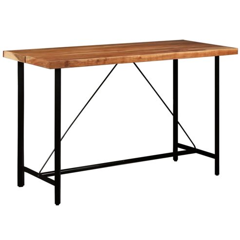 Dieses coole Bar-Set hat einen industriellen Look, das eine unverwechselbare Ergänzung für jedes Zuhause, jede Bar oder jedes Restaurant darstellt. Der Bartisch besteht aus massivem Akazienholz, das langlebig, stabil und leicht zu reinigen ist. Die robusten Stahlbeine machen den Bartisch sehr robust und langlebig und tragen zu seinem spektakulären Industrie-Stil bei. Die perfekte Handwerkskunst garantiert, dass jeder Schritt des Fertigungsprozesses mit größter Sorgfalt ausgeführt wird, sei es Polieren oder Lackieren. Die Barstühle mit ikonischer Optik sind mit echtem Leder bezogen, das sich weich anfühlt und den Stuhl extrem langlebig macht. Die Polsterung sorgt für ein komfortables Sitzerlebnis, während die starken Eisenbeine für Stabilität und Haltbarkeit sorgen. Das Barset ist einfach zu montieren. Wichtiger Hinweis: Holzmaserung und Farben variieren von Stück zu Stück und machen jedes Möbelstück einzigartig. Die Lieferung erfolgt nach dem Zufallsprinzip. ** Tisch : ** Farbe: Schwarz ** Material: Akazien-Massivholz, Stahl ** Abmessungen: 180 x 70 x 107 cm (L x B x H) ** Poliert, gestrichen und lackiert ** Stühle: ** Farbe: Braun und Schwarz ** Material: Echtes Ziegenleder, Eisen ** Maße: 42 x 45 x 86 cm (B x T x H) ** Lieferung enthält: ** 1 x Tisch ** 6 x Lederstuhl
