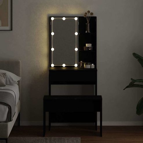 Das Schminktischset ist eine smarte und moderne Lösung, die Stil und Funktionalität in jedes Schlafzimmer oder Wohnzimmer bringt. Es kombiniert ein schlichtes, minimalistisches Design mit praktischem Stauraum, ideal, um deine Sachen ordentlich zu halten und dabei stylisch auszusehen. Perfekt für Fans von modernem Design, vereint dieses Teil Stil und Praktikabilität und schafft einen ansprechenden und organisierten Raum. Sein raffiniertes Design und die coolen Features machen es zu einer vielseitigen Ergänzung für jedes Interieur. Robuster Holzwerkstoff: Der Schminktisch besteht aus hochwertigem Holzwerkstoff und hat einen stabilen Rahmen, der dem täglichen Gebrauch standhält. Das strapazierfähige Material sorgt dafür, dass er nicht schnell abnutzt und ein dauerhafter Teil deiner Einrichtung wird. Ordentlicher Stauraum: Mit vielen Ablagemöglichkeiten wie Regalen und Schubladen bietet dieser Schminktisch eine praktische Lösung, um alles ordentlich zu halten. Die stabilen Regale bieten Platz für alles, von Make-up bis zu persönlichen Gegenständen, sodass du alles griffbereit hast. Effiziente LED-Beleuchtung: Die LED-Streifen sorgen für das perfekte Licht beim Benutzen deines Schminktisches. Egal, ob du dein Make-up machst oder dich für den Tag fertig machst, diese hellen, verstellbaren Lichter helfen dir, alles klar zu sehen, ohne zu grell zu sein. Und sie sind energieeffizient, was dein Zuhause umweltfreundlicher macht. Kompaktes modernes Design: Das moderne Design passt perfekt in jede Einrichtung. Die strukturierte Oberfläche sieht toll aus und ist pflegeleicht. Die rechteckige Form und das schlanke Profil passen zu vielen Einrichtungsstilen, ohne den Raum zu überwältigen. Einfache Pflege: Halte den Schminktisch supereinfach in Schuss – wisch ihn einfach mit einem trockenen Tuch ab und vermeide scharfe Chemikalien, um ihn wie neu aussehen zu lassen. Mit minimalem Aufwand bleibt dieses Stück eine zuverlässige Ergänzung für den Alltag und vereint Stil und Funktionalität ohne viel Aufwand. ** Farbe: Schwarze eiche ** Material: Holzwerkstoff ** Beenden: Strukturiert ** Gewicht: 29.1 kg ** Stromquelle: Usb ** Lichtertyp: Led-streifen ** Lichter farbe: Weiß ** mit 1 Schublade ** Mit flachspiegel spiegel ** Mit 2 regalen ** Innen- / außenbereich: Nur für drinnen ** Lieferung: ** 1 x Ankleidetisch Set ** Anzahl der elemente: 1 ** Versammlung erforderlich: Ja Dieses Produkt wird mit 5 V Gleichstrom betrieben, aber die zertifizierte 5-V-USB-Stromquelle ist nicht im Lieferumfang enthalten. Eine höhere Spannung kann zu einer Überhitzung führen und das Gerät beschädigen sowie das Risiko von Überhitzung und Brand verursachen.