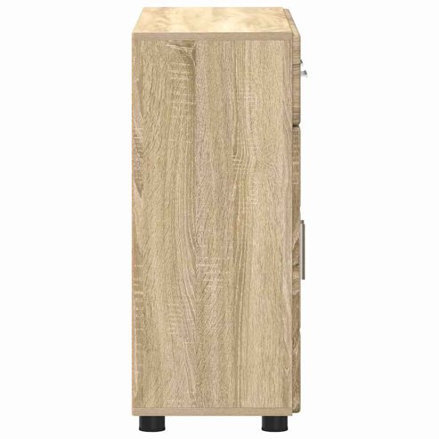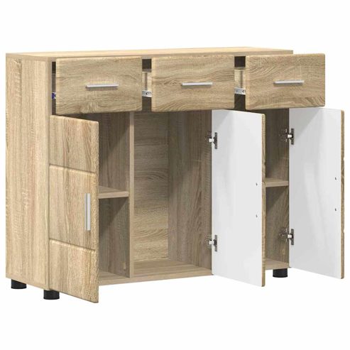 Dieser schick designte Schrank aus Holzwerkstoff ist perfekt für moderne Wohnräume und bietet dir sowohl einen Blickfang als auch super praktische Funktionen. Er hat klare Linien und kommt ohne viel Schnickschnack aus, was ihn zur idealen Wahl für alle macht, die Einfachheit und Funktionalität lieben. Mit seiner rechteckigen Form und matten Oberfläche zeigt der Schrank, wie edel und praktisch zugleich sein kann. Hochwertiger Holzwerkstoff: Der Schrank ist aus robustem Holzwerkstoff gefertigt, der langlebig und stabil ist. Diese Materialien sind super widerstandsfähig, wodurch er dir lange Freude bereitet. Die elegante Oberfläche betont den schlichten Stil, der perfekt in moderne Räume passt. Durchdachtes Design: Mit einem modernen, klaren Design fügt sich der Schrank harmonisch in dein bestehendes Dekor ein. Die schlichte Ästhetik erhöht die Funktionalität deiner Räume, ohne andere Designelemente zu überladen, wodurch er zu einer vielseitigen Wahl wird. Funktionaler Stauraum: Der Schrank bietet ausreichend Platz für all deine Sachen. Die geräumigen Fächer ermöglichen eine ordentliche Aufbewahrung – ideal für Wohnzimmer, Homeoffices oder Schlafzimmer. Die smarte Anordnung sorgt für eine aufgeräumte Umgebung, die sowohl praktisch als auch stilvoll ist. Innenbereich: Dieser Schrank ist speziell für Innenräume gemacht und dient vielen Zwecken, vom Organisieren des Wohnraums bis hin zu einem schicken Homeoffice. Er hilft, die Unordnung zu minimieren und eine ruhige Atmosphäre zu schaffen. Einfache Pflege: Pflegeleicht ist er auch: Einfach ein feuchtes Tuch nehmen und abwischen. Diese minimalen Pflegeanforderungen sorgen dafür, dass der Schrank über die Jahre gut aussieht und ein schickes Stück in deinem Zuhause bleibt. ** Farbe: Sonoma-Eiche ** Material: Holzwerkstoff ** Oberfläche: Matt ** Gesamtabmessungen: 88,5 x 30,5 x 73 cm (L x B x H) ** Gewicht: 26,9 kg ** Langlebig ** Reichlich Stauraum ** mit 3 Brett-Regale ** Rahmenmaterial: Holzwerkstoff ** mit 2 Scharniertüren ** Nur für den Innenbereich ** Lieferumfang: ** 1 x Sideboard ** Montage erforderlich: Ja