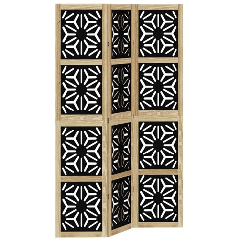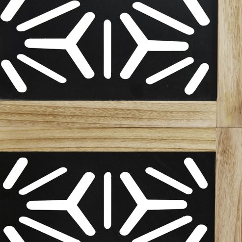 Verleihe deinem Wohnraum eine auffällige dekorative Note mit diesem bezaubernden Raumteiler. Langlebig und leicht zu reinigen: Der Sichtschutz ist aus Paulownia-Massivholz und Holzwerkstoff gefertigt, wodurch er pflegeleicht und strapazierfähig ist.Robuster Rahmen: Der Rahmen aus massivem Paulownia-Holz sorgt für Robustheit und Stabilität. Paulownia-Massivholz ist ein wunderschönes Naturmaterial. Paulowniaholz ist widerstandsfähig gegen Schädlingsbefall und Verrottung.Flexibel und einfach faltbar: Die Paravent-Teile sind jeweils durch 3 Metallscharniere miteinander verbunden. Die oberen und unteren Paneele dieser spanischen Wand sind durch verborgene 2-in-1-Scharniere verbunden. Der Raumtrenner kann also leicht bis zu einem gewissen Grad zusammengeklappt werden; dadurch spart er bei Nichtgebrauch Platz.Vielseitig einsetzbar: Der Raumtrenner eignet sich hervorragend zur Schaffung von Privatsphäre im Schlafzimmer, Wohnzimmer, Büro und anderen Räumen. Du kannst das Paravent auch vor ein Fenster stellen, um starkes Sonnenlicht abzuschirmen.Attraktiver Look: Mit seinem geometrischen Muster verleiht diese faltbare Trennwand jedem Raum mehr Charakter. Achtung:Nur für den Innenbereich! ** Farbe: Braun und Schwarz ** Rahmen-Material: Paulownia-Massivholz ** Paneel-Material: Holzwerkstoff ** Größe (aufgeklappt): 105-110 x 180 cm (B x H) ** Paneelgröße (pro Stück): 49 x 180 cm (B x H) ** Dicke: 16 mm ** Anzahl der Paneele: 3 ** Nur für den Innenbereich ** Zusammenbau erforderlich: Ja