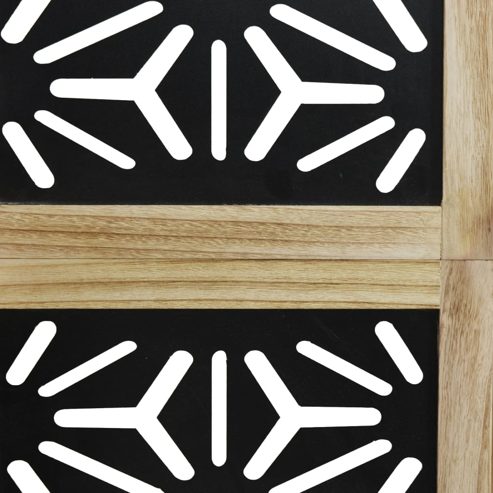 Verleihe deinem Wohnraum eine auffällige dekorative Note mit diesem bezaubernden Raumteiler. Langlebig und leicht zu reinigen: Der Sichtschutz ist aus Paulownia-Massivholz und Holzwerkstoff gefertigt, wodurch er pflegeleicht und strapazierfähig ist.Robuster Rahmen: Der Rahmen aus massivem Paulownia-Holz sorgt für Robustheit und Stabilität. Paulownia-Massivholz ist ein wunderschönes Naturmaterial. Paulowniaholz ist widerstandsfähig gegen Schädlingsbefall und Verrottung.Flexibel und einfach faltbar: Die Paravent-Teile sind jeweils durch 3 Metallscharniere miteinander verbunden. Die oberen und unteren Paneele dieser spanischen Wand sind durch verborgene 2-in-1-Scharniere verbunden. Der Raumtrenner kann also leicht bis zu einem gewissen Grad zusammengeklappt werden; dadurch spart er bei Nichtgebrauch Platz.Vielseitig einsetzbar: Der Raumtrenner eignet sich hervorragend zur Schaffung von Privatsphäre im Schlafzimmer, Wohnzimmer, Büro und anderen Räumen. Du kannst das Paravent auch vor ein Fenster stellen, um starkes Sonnenlicht abzuschirmen.Attraktiver Look: Mit seinem geometrischen Muster verleiht diese faltbare Trennwand jedem Raum mehr Charakter. Achtung:Nur für den Innenbereich! ** Farbe: Braun und Schwarz ** Rahmen-Material: Paulownia-Massivholz ** Paneel-Material: Holzwerkstoff ** Größe (aufgeklappt): 140-145 x 200 cm (B x H) ** Paneelgröße (pro Stück): 40 x 200 cm (B x H) ** Dicke: 16 mm ** Anzahl der Paneele: 4 ** Nur für den Innenbereich ** Zusammenbau erforderlich: Ja