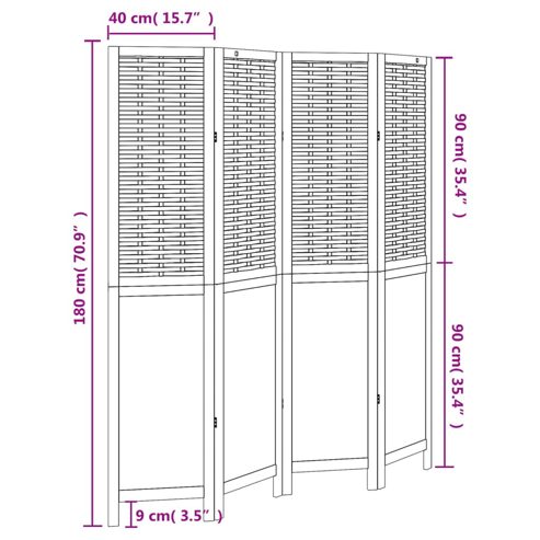 Verleihe deinem Wohnraum eine auffällige dekorative Note mit diesem bezaubernden Raumteiler. Langlebig und pflegeleicht: Der Sichtschutz ist aus natürlichen Bambus und Holzwerkstoff gefertigt, wodurch er leicht zu reinigen und strapazierfähig ist.Robuster Rahmen: Der Rahmen aus massivem Paulownia-Holz sorgt für Robustheit und Stabilität. Paulownia-Massivholz ist ein wunderschönes Naturmaterial. Paulowniaholz ist widerstandsfähig gegen Schädlingsbefall und Verrottung.Flexibel und einfach faltbar: Die Paravent-Teile sind jeweils durch 3 Metallscharniere miteinander verbunden. Die oberen und unteren Paneele dieser spanischen Wand sind durch verborgene 2-in-1-Scharniere verbunden. Der Raumtrenner kann also leicht bis zu einem gewissen Grad zusammengeklappt werden; dadurch spart er bei Nichtgebrauch Platz.Vielseitig einsetzbar: Die Trennwand eignet sich hervorragend zur Schaffung von Privatsphäre im Schlafzimmer, Wohnzimmer, Büro und anderen Räumen. Du kannst das Paravent auch vor ein Fenster stellen, um intensives Sonnenlicht abzuschirmen. Achtung:Nur für den Innenbereich! ** Farbe: Weiß ** Rahmen-Material: Paulownia-Massivholz ** Material: Bambus, Holzwerkstoff ** Größe (aufgeklappt): 140-145 x 180 cm (B x H) ** Paneel-Größe (jeweils): 40 x 180 cm (B x H) ** Dicke: 16 mm ** Anzahl der Paneele: 4 ** Nur für den Innenbereich ** Zusammenbau erforderlich: Ja