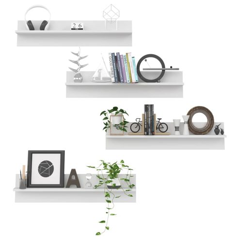 Diese Wandregale weisen ein elegantes und modernes Design auf und werden daher ohne Zweifel ein echter Hingucker in deinem Wohnzimmer sein. Mit ihrem stilvollen und praktischen Design bieten diese Wandregale den perfekten Platz zur Aufbewahrung von Büchern, DVDs, Sammlerstücken, Dekoartikeln usw. Die Konstruktion dieser Hängeregale ist robust und stabil, was eine jahrelange Nutzungsdauer gewährleistet. Daher stellen diese schicken und raffinierten Wandablagen eine attraktive Bereicherung für dein Inneneinrichtung dar. ** Farbe: Weiß ** Material: Holzwerkstoff ** Abmessungen: 80 x 11,5 x 18 cm (B x T x H) ** Zusammenbau erforderlich: Ja ** Lieferung umfasst: ** 4 x Wandregal
