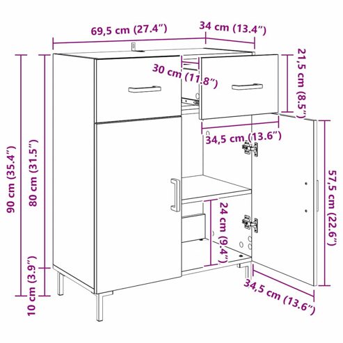 Das Sideboard aus Holzwerkstoff ist eine stylische und praktische Ergänzung für jeden Raum und beeindruckt mit einem schlanken, modernen Design, das im Trend liegt. Seine rechteckige Form und klaren Linien strahlen eine frische Atmosphäre aus, die es zum perfekten Blickfang in Ess- oder Wohnräumen macht. Das coole Design verbessert nicht nur das Aussehen, sondern bietet auch Platz zum Organisieren und Ausstellen von Deko oder zur Aufbewahrung von Geschirr. Dieses Sideboard aus Holzwerkstoff ist langlebig und widerstandsfähig und sorgt für jahrelangen zuverlässigen Gebrauch. Es fügt sich nahtlos in verschiedene Deko-Stile ein und bietet eine schicke und ordentliche Lösung für deinen Stauraum. Holzwerkstoff-Konstruktion: Das Sideboard ist aus hochwertigem Holzwerkstoff gemacht, der für Haltbarkeit und Stabilität sorgt. Dieses Material ist robust genug, um täglichen Nutzen zu überstehen und dabei toll auszusehen. Geräumiger Stauraum: Das Sideboard hat viel Platz für die Aufbewahrung, bietet Regalbretter und einfache Schubladen mit Scharnier-Türen für besseren Zugriff auf deine Sachen. Ideal für Bereiche, wo viel Stauraum gebraucht wird. Moderne Gestaltung: Mit einem modernen Look ergänzt das Sideboard stylish zeitgenössische Räume. Die klaren Linien und das einfache Design machen es vielseitig einsetzbar - ob in urbanen Loft oder in einem gemütlichen Zuhause. Praktische Komponenten: Das Sideboard hat D-Griffe für einfaches Öffnen und die stabilen quadratischen Eisenbeine geben ihm ein cooles industrielles Flair. Das sorgt dafür, dass es nicht nur gut aussieht, sondern auch super funktioniert. Montage erforderlich: Das Sideboard muss von zwei Personen zusammengebaut werden und benötigt alltägliche Werkzeuge. Dieses einfache Verfahren garantiert, dass alles fest zusammengebaut wird und du es schnell nutzen kannst. So bist du Teil des Prozesses, im Aufbau deines funktionalen Möbelstücks für dein Zuhause. ** Farbe: Altholz ** Material: Holzwerkstoff ** Gesamtabmessungen: 69,5 x 34 x 90 cm (L x B x H) ** mit 2 Schubladen ** mit 2 Scharniertüren ** Stauraum ** Montage erforderlich: Ja ** Lieferumfang: ** 1 x Sideboard