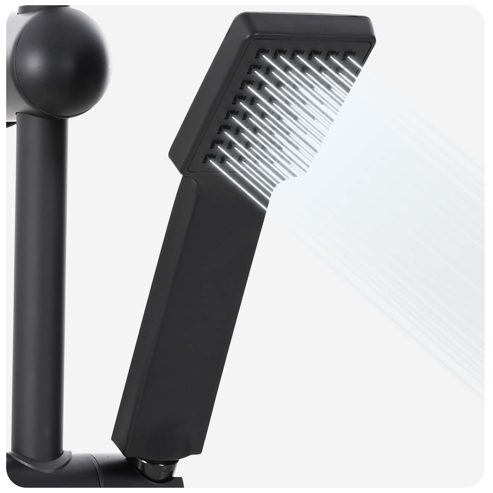 Unser Duschsystem ist genau das richtige für dich, wenn du dein Badezimmer in eine Spa-ähnliche Oase verwandeln willst. Es vereint Einfachheit und Funktionalität und kombiniert schlanke Linien mit wenig Schnickschnack, um dir ein komfortables und flexibles Duscherlebnis zu bieten. Für drinnen gedacht, ist dieses System perfekt für jede Jahreszeit und sorgt für Entspannung und neue Energie, egal ob im Sommer oder Winter. Der polierte Look macht es zur top Wahl für moderne Haushalte, die ihr Badezimmerdesign frischer gestalten wollen. Haltbare Materialien: Aus Messing und ABS gefertigt, sorgt dieses System für lange Haltbarkeit. Teile wie SUS201 machen die Dusche robust und zuverlässig für den täglichen Einsatz. Diese Materialien sind speziell gewählt, damit der Glanz bleibt und das System lange hält und dir ein tolles Erlebnis bietet. Verstellbare Winkel: Genieße ein individuell angepasstes Duscherlebnis mit Komponenten, die bis zu 15° neigbar sind, sodass du den Duschkopf einfach ohne Werkzeuge einstellen kannst. So bekommst du die perfekte Einstellung, die deinen Vorlieben entspricht. Integrierte Dualfunktionalität: Mit dem 2-in-1 Design hast du sowohl feste als auch Handduschen, was die Flexibilität beim Wasserfluss und der Abdeckung erhöht. Diese duale Funktion passt zu allen Duschvorlieben und ist für die ganze Familie geeignet. Einfache und elegante Gestaltung: Mit seinem schlichten, modernen Duschsystem genießt du eine zeitlose Ästhetik. Das minimalistische Design ergänzt tolle Badezimmerstile, ohne andere Dekor-Elemente zu überdecken. Wartung und Montage: Folge den Montageanleitungen des Herstellers und nutze gängige Werkzeuge wie Bohrmaschine oder Schraubendreher. Regelmäßige Anpassungen werden durch simple Mechaniken erleichtert, die das System funktional und ansprechend halten. ** Farbe: Schwarz ** Material: Messing, Sus201 und ABS ** Gesamtabmessungen: 45 x 20 x 96 cm (L x B x H) ** Gewicht: 1,3 kg ** Kippbar ** 2-in-1 Duschsystem ** Verstellbarer Winkelgrad: Neigt sich um 15° nach oben und unten ** Innen- / Außenbereich: Nur für den Innenbereich ** Lieferumfang: ** 1 x Duschsystem ** Montage erforderlich: Ja