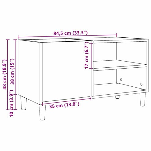 In diesem praktischen und klassischen Plattenschrank kannst du deine Schallplatten aufbewahren und zur Schau stellen. Langlebiges Material: Holzwerkstoff ist ein Material von außergewöhnlicher Qualität mit glatter Oberfläche, das sich durch Festigkeit, Stabilität und Feuchtigkeitsbeständigkeit auszeichnet.Viel Stauraum: Der geräumige Schallplattenschrank bietet reichlich Stauraum für LP-Schallplatten, um deine Musiksammlung ordentlich aufzubewahren.Stabile Oberplatte: Die robuste Oberplatte des Vinylschrankes bietet den idealen Platz für deinen Plattenspieler oder andere elektronische Geräte.Mehrere Funktionen: Dieser Plattenschrank kann auch als Beistellschrank im Wohnzimmer oder als Aktenschrank im Büro und Arbeitszimmer verwendet werden.Holzbeine: Die Holzbeine verleihen dem Schallplattenschrank eine natürliche und angenehme Optik und sorgen gleichzeitig für Stabilität. ** Farbe: Artisan-Eiche ** Material: Holzwerkstoff, Massivholz Eukalyptus ** Abmessungen: 84,5 x 38 x 48 cm (B x T x H) ** Zusammenbau erforderlich: Ja