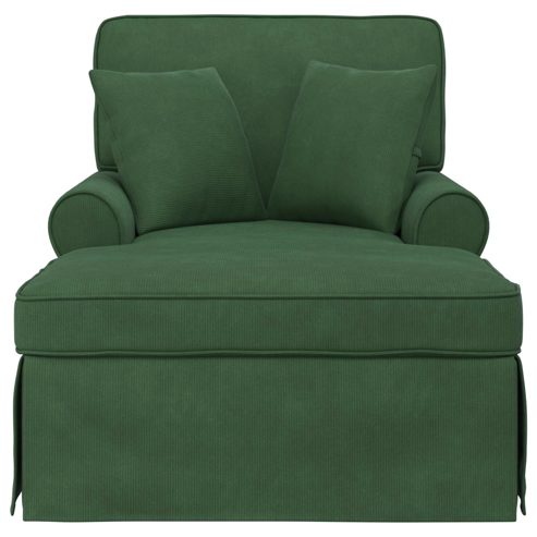 Diese moderne Chaiselongue mit Rock bringt den Charme von stilvoller Eleganz in dein Zuhause. Sie wurde für Stil und Funktion entworfen und bringt ein modernes Flair in jedes Wohnzimmer. Ihr gerippter Stoff und das Rockdesign sorgen für ein sauberes, elegantes Aussehen, das perfekt für Innenräume ist. In ihrer rechteckigen Form und mit weicher Polsterung ist diese Lounge ideal, um nach einem langen Arbeitstag zu relaxen. Sie bietet ein warmes, einladendes Gefühl, das dich in den Komfort hüllt. Premium-Rippstoff Diese Chaiselongue hat einen hochwertigen Rippstoff, der sich weich anfühlt und das luxuriöse Gefühl stärkt. Neben der Eleganz sorgt der Stoff auch für Haltbarkeit und widersteht dem täglichen Gebrauch. Funktionales Rockdesign Der schicke Rock ist nicht nur schön, indem er die Beine verdeckt, sondern verhindert auch Staubansammlungen. Dieses durchdachte Designdetail passt perfekt zum modernen Stil und verbindet Form mit Funktion. Abnehmbare Kissen Mit praktischen Reißverschlusskissen versprechen der Sitz und die Armlehnen Komfort und lassen sich einfach abnehmen. Sie sorgen für unkomplizierte Pflege und erhöhen die Lebensdauer. Gepolsterte Armlehnen Genieße zusätzlichen Komfort mit den stark gepolsterten Armlehnen. Diese Funktion fördert die Entspannung und macht diese Lounge zur perfekten Wahl für entspannte und gemütliche Zeiten. Nur für den Innenbereich Diese Chaiselongue wurde speziell für den Innenbereich entworfen und passt hervorragend in jedes Wohnzimmer. Ihre Materialien und Merkmale sind auf die Bedürfnisse des Indoor-Komforts und der Ästhetik abgestimmt. ** Farbe: Dschungelgrün ** Material: Rippenstoff ** Gesamtabmessungen: 91 x 157 x 91 cm (L x B x H) ** Gewicht: 27,9 kg ** Langlebig ** Verschleißfest ** Warmes und gemütliches Gefühl ** Das stilvolle Rockdesign verbirgt die Beine und hält Staub fern ** Armlehnenhöhe vom Sitz aus: 11 cm ** Sitzbereich: 87 x 127 cm (B x T) ** Sitzkissen abnehmbar: Reißverschluss ** Sitzhöhe vom Boden: 42 cm ** Rahmenmaterial: Sperrholz ** mit 2 Kissen ** Max. Gewicht: 110 kg ** Nur für den Innenbereich ** Lieferumfang: ** 1 x Chaise Lounge ** Montage erforderlich: Ja