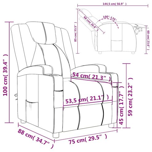 Lehne sich zurück und entspanne sich in diesem äußerst bequemen Relaxsessel! Manuelle Liegefunktion: Der Sessel kann manuell in 3 Positionen verstellt werden, so dass die Rückenlehne und der Fußteil je nach Bedarf eingestellt werden können.Bequemes Sitzerlebnis: Der dick gepolsterte Sitz, die Rückenlehne und die breiten, mit Kunstleder bezogenen Armlehnen sorgen für ein behagliches und angenehmes Sitzgefühl. Künstliches Leder ist ein äußerst langlebiges Material. Es ist schmutzabweisend und lässt sich mit einem feuchten Tuch einfach reinigen. Durch die glatte Oberfläche weist es die luxuriöse Schönheit von Echtleder auf.Solider und stabiler Rahmen: Der Rahmen aus Holz und Metall sorgt für eine solide Struktur und hohe Stabilität. Dieser TV-Sessel ist bequem und langlebig. ** Farbe: Braun ** Material: Kunstleder (60 % Polyurethan, 30 % Polyester, 10 % Baumwolle), Metall, Sperrholz ** Füllung: Schaumstoff ** Abmessungen in Sitzposition: 75 x 88 x 100 cm (B x T x H) ** Abmessungen in Liegeposition: 75 x 144,5 x 85 cm (B x T x H) ** Sitzgröße: 53,5 x 54 cm (B x T) ** Sitzhöhe vom Boden: 45 cm ** Armlehnenhöhe vom Boden: 59 cm ** Mit 2 Getränkehaltern an den Armlehnen ** Verstellbare Rückenlehne und Fußstütze ** Max. Tragfähigkeit: 110 kg ** Zusammenbau erforderlich: Ja