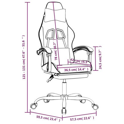 Genieße eine komfortable Sitzposition beim Spielen auf diesem einzigartigen Gaming-Stuhl und verbessere dein Spielerlebnis! Langlebiges Kunstleder: Hochwertiges Kunstleder ist ein äußerst langlebiges Material. Es ist schmutzabweisend und lässt sich mit einem feuchten Tuch einfach reinigen. Durch die glatte Oberfläche weist es die Schönheit von Echtleder und einen luxuriösen Look auf.Bequeme Kissen und Fußstütze: Zu deiner Bequemlichkeit ist der Stuhl mit zusätzlichen Kissen versehen. Diese Kissen entspannen deinen Kopf und deine Taille erheblich beim Liegen auf dem Stuhl. Die Fußstütze bietet zusätzlichen Komfort.Verstellbare Rückenlehne und Höhe: Dank der verstellbaren Rückenlehne genießt du höchsten Komfort durch Auswahl einer optimalen Sitzposition. Verwende den Hebel, um die Höhe deines Sitzes nach Belieben einzustellen.Praktisches Design: Der Stuhl lässt sich auch um 360 Grad drehen, um eine größere Bewegungsfreiheit zu ermöglichen. Darüber hinaus lässt sich der Stuhl dank Rollen bequem umher verschieben.Robustes Gestell: Das Gestell aus Metall und Sperrholz sorgt für Robustheit und Stabilität. Hinweis:Jedes Produkt wird mit einer Montageanleitung in der Verpackung für eine einfache Montage geliefert.Das Produkt verfügt über einen USB-Anschluss, aber die zertifizierte 5-V-USB-Stromquelle ist nicht im Lieferumfang enthalten. ** Farbe: Schwarz und Orange ** Material: Kunstleder (75% Polyvinylchlorid, 5% Baumwolle, 20% Polyester), Metall, Sperrholz ** Füllung: Schaumstoff ** Gesamtabmessungen: 57,5 x 59,5 x (121-131) cm (B x T x H) ** Abmessungen in Liegeposition: 57,5 x 129,5 x (108,5-118,5) cm (B x T x H) ** Sitzfläche: 36,5 x 42 cm (B x T) ** Sitzhöhe vom Boden: 44,5-54,5 cm ** Armlehnenhöhe vom Boden: 68,5-78 cm ** Maximaler Neigungswinkel: 135 Grad ** Eingangsspannung: DC 5V ** Eingangsstrom: 2A ** Massagepunkt im Taillenkissen ** Mit Gasdruckfeder ** Höhenverstellbar ** Liegefunktion ** Mit Fußstütze ** Mit Rollen Achte auf die Gefahr von offenem Feuer und anderen starken Wärmequellen in der Nähe des Produkts. Maximal 110 kg pro Sitz. Dieses Produkt wird mit 5 V Gleichstrom betrieben, aber die zertifizierte 5-V-USB-Stromquelle ist nicht im Lieferumfang enthalten. Eine höhere Spannung kann zu einer Überhitzung führen und das Gerät beschädigen sowie das Risiko einer Überhitzung und eines Brandes bergen.