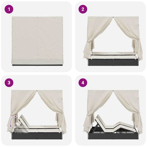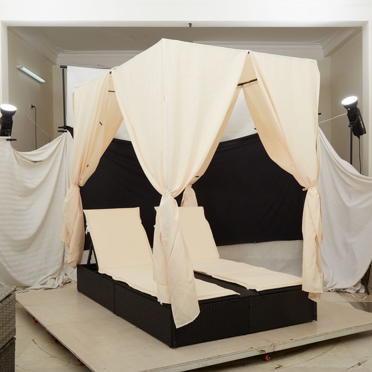 Check die coole Outdoor-Doppelsonnenliege mit Dach und Vorhängen aus – der perfekte Ort zum Relaxen im Freien. Stell dir vor, du genießt die Sonne an einem schönen Morgen oder chillst an einem kühlen Abend in dieser genialen Liege und genießt den Schatten. Mit ihrem schicken Design und der flexiblen Anordnung ist sie die perfekte Wahl für Gärten oder Terrassen und bietet dir ein fantastisches Outdoor-Erlebnis. Hochwertige Materialien: Die Liege ist aus Poly-Rattan, sieht schick aus und ist UV-beständig sowie wetterfest. Ihr Stahlrahmen bietet Stabilität und Langlebigkeit, also ideal für den Außeneinsatz. Inklusive Komponenten: Du bekommst ein Dach, 8 Seitenvorhänge und 2 Sitzkissen dazu. Die Vorhänge bieten Privatsphäre, und die abnehmbaren Kissenbezüge sind super easy zu reinigen. Funktionsverbesserndes Design: Mit verstellbaren Rückenlehnen- und Fußstützen findest du immer die perfekte Position, um zu relaxen, die Sonne zu genießen oder ein Buch zu lesen. Vielseitige Nutzung: Egal, ob in deinem Garten oder auf der Terrasse – diese Liege ist für jede Art von Spaß im Freien gedacht. Sie ist der perfekte Begleiter für Sommerabende beim Sonnenuntergang oder für ruhige Morgenstunden. Einfache Pflege: Die Sitzkissen haben abnehmbare Bezüge, die leicht zu waschen sind. Mit Poly-Rattan und Metallkonstruktion reicht eine schnelle Reinigung, also super pflegeleicht. ** Farbe: Schwarz ** Material: Pe rattan ** Gesamtabmessungen: 205 x 129 x 200 cm (L x B x H) ** Innen- / außenbereich: Nur für draußen ** Lieferung: ** 1 x Doppelte Sonnenliege, 1 x Dachdachstoff mit 8 Seitenvorhängen, 2 x Sitzkissen mit abnehmbarem und waschbarem Bezug ** Anzahl der elemente: 1 ** Versammlung erforderlich: Ja
