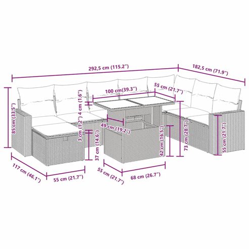 Diese Garten-Sofagarnitur ist die perfekte Ergänzung zu deinem Garten, deiner Terrasse oder deinem Innenhof. Sie bietet einen bequemen und einladenden Platz, um mit Familie und Freunden zu plaudern oder dich einfach nur zu entspannen und das Leben im Freien zu genießen.Langlebiges Material: PE-Rattan, auch als Poly Rattan bekannt, ist ein robustes, pflegeleichtes synthetisches Material, das die Optik von natürlichem Rattan aufweist. Es kennzeichnet sich durch ein geringes Eigengewicht und lässt sich einfach reinigen. Aufgrund seiner Haltbarkeit und Witterungsbeständigkeit wird es häufig bei der Herstellung von Gartenmöbeln verwendet.Stauraum mit wasserfestem Beutel: Jedes Gartensofa verfügt über ein Staufach unter der Sitzfläche, das mit einem wasserfesten Beutel zur Aufbewahrung von Kissen, Spielzeug und anderen Gegenständen versehen ist. Die Kissen sind mit Bezügen versehen und lassen sich mit Klettverschlüssen fest und sicher an den Sofas befestigen.Praktische Ablage: Dieses Gartensofa verfügt über eine klappbare Ablage mit Gasfeder, auf der du verschieden Sachen griffbereit aufbewahren kannst.Abnehmbarer und waschbarer Bezug: Diese Sitzkissen verfügen über abnehmbare Bezüge für einfaches Waschen und Pflegen.Modulares Design: Dank des modularen Designs lassen sich die Gartenmöbel völlig flexibel und einfach umstellen, um deinen Außenbereich ganz individuell zu gestalten.Gut zu wissen:Wir empfehlen dir, deine Gartenmöbel mit einer wasserdichten Hülle zu schützen, um lange Zeit eine ansprechende Optik aufzuweisen. ** Maximale Tragfähigkeit (pro Sitz ): 110 kg ** UV-beständig ** Verstellbare Füße aus Kunststoff ** Zusammenbau erforderlich: Ja ** Ecksofa: ** Farbe: Schwarz ** Material: PE-Rattan, pulverbeschichteter Stahl ** Abmessungen: 62 x 62 x 69 cm (B x T x H) ** Sitzgröße: 55 x 55 cm (B x T) ** Sitzhöhe vom Boden (ohne Kissen): 37 cm ** Mittelsofa: ** Farbe: Schwarz ** Material: PE-Rattan, pulverbeschichteter Stahl ** Abmessungen: 55 x 62 x 69 cm (B x T x H) ** Sitzgröße: 55 x 55 cm (B x T) ** Sitzhöhe vom Boden (ohne Kissen): 37 cm ** Mittelsofa: ** Farbe: Schwarz ** Material: PE-Rattan, pulverbeschichteter Stahl ** Abmessungen: 55 x 62 x 69 cm (B x T x H) ** Sitzgröße: 55 x 55 cm (B x T) ** Sitzhöhe vom Boden (ohne Kissen): 37 cm ** Abmessungen des wasserfesten Beutels: 55 x 53 x 34 cm (L x B x H) ** Hocker: ** Farbe: Schwarz ** Material: PE-Rattan, pulverbeschichteter Stahl ** Abmessungen: 55 x 55 x 37 cm (B x T x H) ** Ecksofa mit Armlehne aus Rattan: ** Farbe: Schwarz ** Material: PE-Rattan, pulverbeschichteter Stahl ** Abmessungen: 65,5 x 62 x 69 cm (B x T x H) ** Sitzgröße: 55 x 55 cm (B x T) ** Sitzhöhe vom Boden (ohne Kissen): 37 cm ** Armlehnenhöhe vom Boden: 55 cm ** Breite der Armlehnen: 10 cm ** Tisch: ** Farbe: Schwarz ** Material: PE-Rattan, pulverbeschichteter Stahl, Hartglas ** Abmessungen: 100 x 55 x 44/73 cm (L x B x H) ** Kissen: ** Farbe: Marineblau ** Bezugsmaterial: Stoff (100% Polyester) ** Füllmaterial des Sitzkissen: Schaumstoff ** Füllmaterial des Rückenkissens: Baumwollfaser ** Abmessungen des Sitzkissens: 55 x 55 x 3 cm (B x T x H) ** Abmessungen des Rückenkissens: 55 x 45 x 13 cm (L x B x T) ** Lieferung umfasst: ** 1 x Gartentisch ** 1 x Ecksofa mit Stauraum und wasserfestem Beutel ** 2 x Ecksofa mit Armlehne aus Rattan, Stauraum und wasserfestem Beutel ** 4 x Mittelsofa mit Stauraum und wasserfestem Beutel ** 1 x Hocker mit Stauraum und wasserfestem Beutel ** 8 x Sitzkissen mit abnehmbarem und waschbarem Bezug ** 8 x Rückenkissen