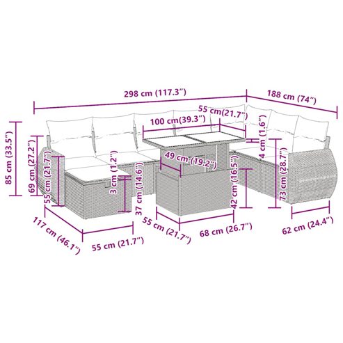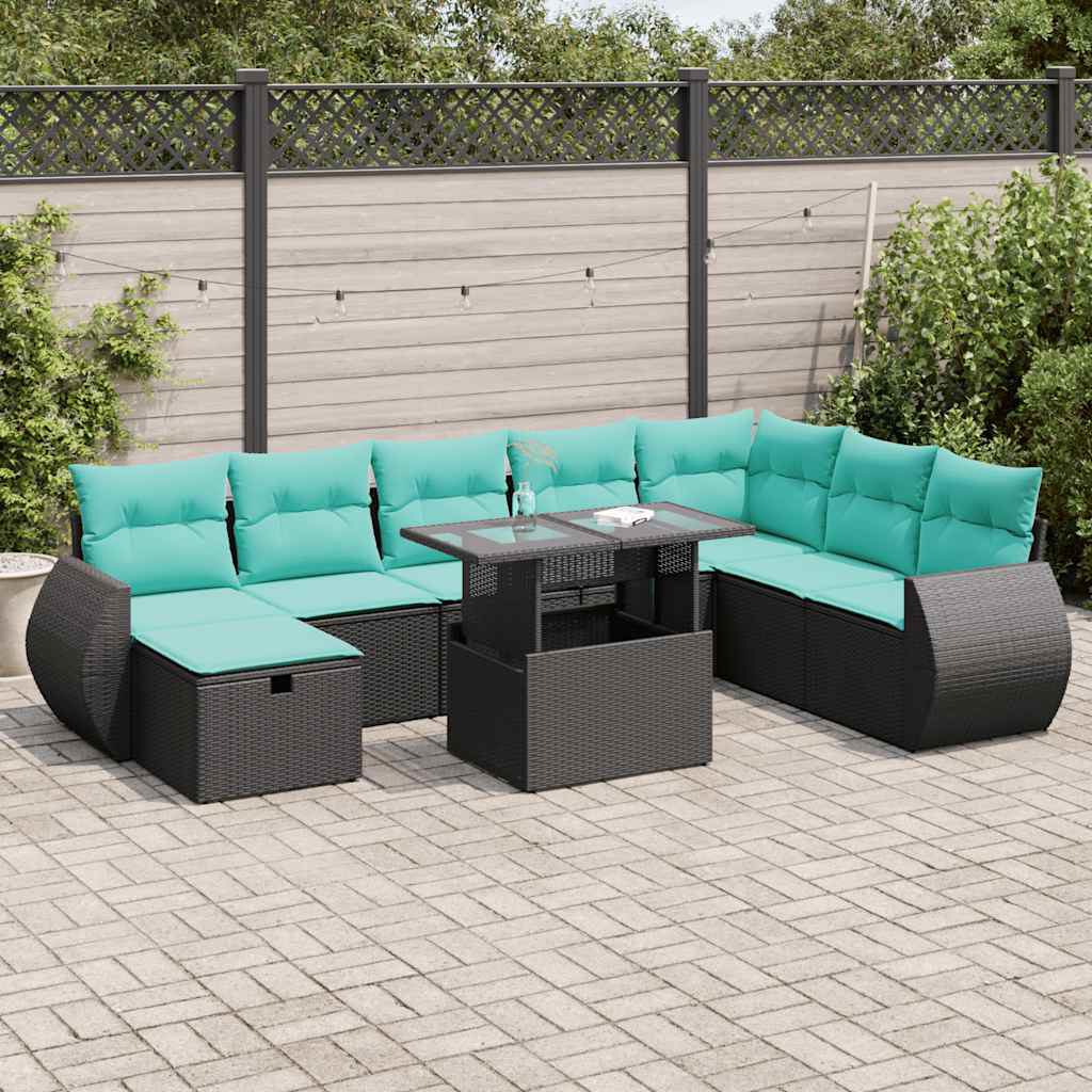 Diese Garten-Sofagarnitur ist die perfekte Ergänzung zu deinem Garten, deiner Terrasse oder deinem Innenhof. Sie bietet einen bequemen und einladenden Platz, um mit Familie und Freunden zu plaudern oder dich einfach nur zu entspannen und das Leben im Freien zu genießen.Langlebiges Material: PE-Rattan, auch als Poly Rattan bekannt, ist ein robustes, pflegeleichtes synthetisches Material, das die Optik von natürlichem Rattan aufweist. Es kennzeichnet sich durch ein geringes Eigengewicht und lässt sich einfach reinigen. Aufgrund seiner Haltbarkeit und Witterungsbeständigkeit wird es häufig bei der Herstellung von Gartenmöbeln verwendet.Stauraum mit wasserfestem Beutel: Jedes Gartensofa verfügt über ein Staufach unter der Sitzfläche, das mit einem wasserfesten Beutel zur Aufbewahrung von Kissen, Spielzeug und anderen Gegenständen versehen ist. Die Kissen sind mit Bezügen versehen und lassen sich mit Klettverschlüssen fest und sicher an den Sofas befestigen.Praktische Ablage: Dieses Gartensofa verfügt über eine klappbare Ablage mit Gasfeder, auf der du verschieden Sachen griffbereit aufbewahren kannst.Abnehmbarer und waschbarer Bezug: Diese Sitzkissen verfügen über abnehmbare Bezüge für einfaches Waschen und Pflegen.Modulares Design: Dank des modularen Designs lassen sich die Gartenmöbel völlig flexibel und einfach umstellen, um deinen Außenbereich ganz individuell zu gestalten.Gut zu wissen:Wir empfehlen dir, deine Gartenmöbel mit einer wasserdichten Hülle zu schützen, um lange Zeit eine ansprechende Optik aufzuweisen. ** Maximale Tragfähigkeit (pro Sitz ): 110 kg ** UV-beständig ** Verstellbare Füße aus Kunststoff ** Zusammenbau erforderlich: Ja ** Ecksofa: ** Farbe: Schwarz ** Material: PE-Rattan, pulverbeschichteter Stahl ** Abmessungen: 62 x 62 x 69 cm (B x T x H) ** Sitzgröße: 55 x 55 cm (B x T) ** Sitzhöhe vom Boden (ohne Kissen): 37 cm ** Mittelsofa: ** Farbe: Schwarz ** Material: PE-Rattan, pulverbeschichteter Stahl ** Abmessungen: 55 x 62 x 69 cm (B x T x H) ** Sitzgröße: 55 x 55 cm (B x T) ** Sitzhöhe vom Boden (ohne Kissen): 37 cm ** Mittelsofa: ** Farbe: Schwarz ** Material: PE-Rattan, pulverbeschichteter Stahl ** Abmessungen: 55 x 62 x 69 cm (B x T x H) ** Sitzgröße: 55 x 55 cm (B x T) ** Sitzhöhe vom Boden (ohne Kissen): 37 cm ** Abmessungen des wasserfesten Beutels: 55 x 53 x 34 cm (L x B x H) ** Hocker: ** Farbe: Schwarz ** Material: PE-Rattan, pulverbeschichteter Stahl ** Abmessungen: 55 x 55 x 37 cm (B x T x H) ** Ecksofa mit Armlehne aus Rattan: ** Farbe: Schwarz ** Material: PE-Rattan, pulverbeschichteter Stahl ** Abmessungen: 71 x 62 x 69 cm (B x T x H) ** Sitzgröße: 55 x 55 cm (B x T) ** Sitzhöhe vom Boden (ohne Kissen): 37 cm ** Armlehnenhöhe vom Boden: 55 cm ** Tisch: ** Farbe: Schwarz ** Material: PE-Rattan, pulverbeschichteter Stahl, Hartglas ** Abmessungen: 100 x 55 x 44/73 cm (L x B x H) ** Kissen: ** Farbe: Marineblau ** Bezugsmaterial: Stoff (100% Polyester) ** Füllmaterial des Sitzkissen: Schaumstoff ** Füllmaterial des Rückenkissens: Baumwollfaser ** Abmessungen des Sitzkissens: 55 x 55 x 3 cm (B x T x H) ** Abmessungen des Rückenkissens: 55 x 45 x 13 cm (L x B x T) ** Lieferung umfasst: ** 1 x Gartentisch ** 1 x Ecksofa mit Stauraum und wasserfestem Beutel ** 2 x Ecksofa mit Armlehne aus Rattan, Stauraum und wasserfestem Beutel ** 4 x Mittelsofa mit Stauraum und wasserfestem Beutel ** 1 x Hocker mit Stauraum und wasserfestem Beutel ** 8 x Sitzkissen mit abnehmbarem und waschbarem Bezug ** 8 x Rückenkissen