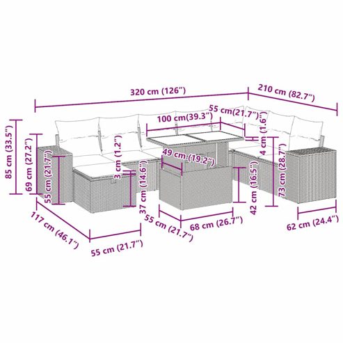 Diese Garten-Sofagarnitur ist die perfekte Ergänzung zu deinem Garten, deiner Terrasse oder deinem Innenhof. Sie bietet einen bequemen und einladenden Platz, um mit Familie und Freunden zu plaudern oder dich einfach nur zu entspannen und das Leben im Freien zu genießen.Langlebiges Material: PE-Rattan, auch als Poly Rattan bekannt, ist ein robustes, pflegeleichtes synthetisches Material, das die Optik von natürlichem Rattan aufweist. Es kennzeichnet sich durch ein geringes Eigengewicht und lässt sich einfach reinigen. Aufgrund seiner Haltbarkeit und Witterungsbeständigkeit wird es häufig bei der Herstellung von Gartenmöbeln verwendet.Stauraum mit wasserfestem Beutel: Jedes Gartensofa verfügt über ein Staufach unter der Sitzfläche, das mit einem wasserfesten Beutel zur Aufbewahrung von Kissen, Spielzeug und anderen Gegenständen versehen ist. Die Kissen sind mit Bezügen versehen und lassen sich mit Klettverschlüssen fest und sicher an den Sofas befestigen.Abnehmbarer und waschbarer Bezug: Diese Sitzkissen verfügen über abnehmbare Bezüge für einfaches Waschen und Pflegen.Modulares Design: Dank des modularen Designs lassen sich die Gartenmöbel völlig flexibel und einfach umstellen, um deinen Außenbereich ganz individuell zu gestalten.Gut zu wissen:Wir empfehlen dir, deine Gartenmöbel mit einer wasserdichten Hülle zu schützen, um lange Zeit eine ansprechende Optik aufzuweisen. ** Maximale Tragfähigkeit (pro Sitz ): 110 kg ** UV-beständig ** Verstellbare Füße aus Kunststoff ** Zusammenbau erforderlich: Ja ** Ecksofa: ** Farbe: Schwarz ** Material: PE-Rattan, pulverbeschichteter Stahl ** Abmessungen: 62 x 62 x 69 cm (B x T x H) ** Sitzgröße: 55 x 55 cm (B x T) ** Sitzhöhe vom Boden (ohne Kissen): 37 cm ** Mittelsofa: ** Farbe: Schwarz ** Material: PE-Rattan, pulverbeschichteter Stahl ** Abmessungen: 55 x 62 x 69 cm (B x T x H) ** Sitzgröße: 55 x 55 cm (B x T) ** Sitzhöhe vom Boden (ohne Kissen): 37 cm ** Mittelsofa: ** Farbe: Schwarz ** Material: PE-Rattan, pulverbeschichteter Stahl ** Abmessungen: 55 x 62 x 69 cm (B x T x H) ** Sitzgröße: 55 x 55 cm (B x T) ** Sitzhöhe vom Boden (ohne Kissen): 37 cm ** Abmessungen des wasserfesten Beutels: 55 x 53 x 34 cm (L x B x H) ** Hocker: ** Farbe: Schwarz ** Material: PE-Rattan, pulverbeschichteter Stahl ** Abmessungen: 55 x 55 x 37 cm (B x T x H) ** Ecksofa mit Armlehne aus Rattan: ** Farbe: Schwarz ** Material: PE-Rattan, pulverbeschichteter Stahl ** Abmessungen: 93 x 62 x 69 cm (B x T x H) ** Sitzgröße: 55 x 55 cm (B x T) ** Sitzhöhe vom Boden (ohne Kissen): 37 cm ** Armlehnenhöhe vom Boden: 55 cm ** Armlehnenbreite: 27,5 cm ** Tisch: ** Farbe: Schwarz ** Material: PE-Rattan, pulverbeschichteter Stahl, Hartglas ** Abmessungen: 100 x 55 x 44/73 cm (L x B x H) ** Kissen: ** Farbe: Marineblau ** Bezugsmaterial: Stoff (100% Polyester) ** Füllmaterial des Sitzkissen: Schaumstoff ** Füllmaterial des Rückenkissens: Baumwollfaser ** Abmessungen des Sitzkissens: 55 x 55 x 3 cm (B x T x H) ** Abmessungen des Rückenkissens: 55 x 45 x 13 cm (L x B x T) ** Lieferung umfasst: ** 1 x Gartentisch ** 1 x Ecksofa mit Stauraum und wasserfestem Beutel ** 2 x Ecksofa mit Armlehne aus Rattan, Stauraum und wasserfestem Beutel ** 4 x Mittelsofa mit Stauraum und wasserfestem Beutel ** 1 x Hocker mit Stauraum und wasserfestem Beutel ** 8 x Sitzkissen mit abnehmbarem und waschbarem Bezug ** 8 x Rückenkissen
