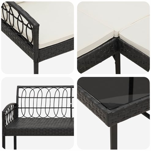 Dieses moderne Garten-Sofaset verwandelt dein Leben im Freien mit seinem klaren Design und der robusten Bauweise. Es bereichert deinen Garten, deine Terrasse und Poolbereiche – perfekt für entspannte Gespräche oder ruhige Abende im Freien. Mit seiner stilvollen und gleichzeitig funktionalen Silhouette ist es ein echter Hingucker in deiner Outdoor-Deko, egal ob beim Grillen oder unter dem Sternenhimmel. Robuste Bauweise: Das Sofaset aus Poly-Rattan und Stahl ist stabil und für den täglichen Einsatz im Freien gemacht. Diese wetterfeste Kombi sorgt dafür, dass die Möbel allen Wetterbedingungen trotzen und lange halten. Glasoberflächen: Der Tisch mit gehärteter Glasoberfläche bietet nicht nur eine schicke, sondern auch pflegeleichte Fläche für Speisen oder Deko. Das Glas ist sicher verarbeitet, um Stöße und Verschüttungen zu vermeiden und vereint Funktionalität mit Stil für deine Outdoor-Veranstaltungen. Poliesterkissen: Mit den weichen, wetterfesten Polyesterkissen bietet dieses Set hervorragenden Komfort und hält mehrere Saisons lang. Die Kissen sind schimmelresistent und verblassen nicht, sodass du lange Freude daran hast. Flexible Anordnung: Das modulare Design ermöglicht dir, das Set nach deinen Wünschen anzuordnen, egal ob für intime Gespräche oder große Feiern. Die L-Form nutzt den Platz optimal aus und schafft Flexibilität im Außenbereich. Pflegehinweise: Mit abnehmbaren Kissenbezügen ist die Reinigung ein Kinderspiel und hält deine Möbel frisch. Wische die Metall- und Glasoberflächen regelmäßig mit einem milden Reiniger ab, damit sie auch in Zukunft toll aussehen. ** Farbe: Schwarz ** Material: Polyrattan und Stahl ** Gewicht: 27,6 kg ** Gesamtabmessungen: 172 x 172 x 74 cm (L x B x H) ** Stoffzusammensetzung: Polyester ** Mit Kissen ** Sitzbreite: 110 cm ** Sitztiefe: 53 cm ** Sitzhöhe vom Boden: 40 cm ** Armlehnenhöhe vom Sitz aus: 17 cm ** Rückenhöhe: 36 cm ** Max. Gewicht: 110 kg pro Sitz ** Sitzplatzkapazität: 5 ** Wetterbeständig ** UV-beständig ** Langlebig ** Leicht zu reinigen ** Abnehmbarer Bezug für das Sitzkissen, einfach zu reinigen ** Nur für den Außenbereich ** Montage erforderlich: Ja ** Lieferumfang: ** 1 x Tisch: 53 x 53 x 40 cm (L x B x H) ** 1 x L-förmiges Sofa: 172 x 172 x 74 cm (L x B x H) ** 2 x Sitzkissen: 110 x 53 x 3 cm (L x B x T) ** 1 x Sitzkissen: 53 x 53 x 3 cm (L x B x T) ** 6 x Rückenpolster: 40 x 40 cm (L x B)