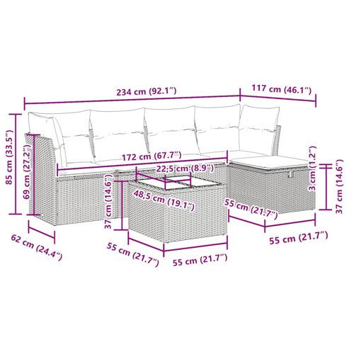 Diese Garten-Sofagarnitur ist die perfekte Ergänzung zu deinem Garten, deiner Terrasse oder deinem Innenhof. Sie bietet einen bequemen und einladenden Platz, um mit Familie und Freunden zu plaudern oder dich einfach nur zu entspannen und das Leben im Freien zu genießen. Langlebiges Material: PE-Rattan, auch als Poly Rattan bekannt, ist ein robustes, pflegeleichtes synthetisches Material, das die Optik von natürlichem Rattan aufweist. Es kennzeichnet sich durch ein geringes Eigengewicht und lässt sich einfach reinigen. Aufgrund seiner Haltbarkeit und Witterungsbeständigkeit wird es häufig bei der Herstellung von Gartenmöbeln verwendet.Stauraum mit wasserfestem Beutel: Jedes Gartensofa verfügt über ein Staufach unter der Sitzfläche, das mit einem wasserfesten Beutel zur Aufbewahrung von Kissen, Spielzeug und anderen Gegenständen versehen ist. Die Kissen sind mit Bezügen versehen und lassen sich mit Klettverschlüssen fest und sicher am Sofa befestigen.Vielseitiger Fußhocker: Der Hocker ist vielseitig einsetzbar und dient als bequeme Fußstütze beim Entspannen auf dem Sofa oder als zusätzlicher Sitzplatz in deinem Garten.Abnehmbarer und waschbarer Bezug: Diese Sitzkissen verfügen über abnehmbare Bezüge für einfaches Waschen und Pflegen.Robustes und stabiles Gestell: Der pulverbeschichtete Stahlgestell ist stark, stabil, langlebig sowie korrosions- und wetterbeständig, um eine lang anhaltende Leistung zu gewährleisten. Gut zu wissen:Wir empfehlen dir, deine Gartenmöbel mit einer wasserdichten Hülle zu schützen, um lange Zeit eine ansprechende Optik aufzuweisen. ** Abmessungen des wasserfesten Beutels: 55 x 53 x 34 cm (L x B x H) ** Maximale Tragfähigkeit (pro Sitz): 110 kg ** UV-beständig ** Verstellbare Füße aus Kunststoff ** Zusammenbau erforderlich: Ja ** Mittelsofa: ** Farbe: Schwarz ** Material: PE-Rattan, pulverbeschichteter Stahl ** Abmessungen: 55 x 62 x 69 cm (B x T x H) ** Sitzgröße: 55 x 55 cm (B x T) ** Sitzhöhe vom Boden (ohne Kissen): 37 cm ** Ecksofa: ** Farbe: Schwarz ** Material: PE-Rattan, pulverbeschichteter Stahl ** Abmessungen: 62 x 62 x 69 cm (B x T x H) ** Sitzgröße: 55 x 55 cm (B x T) ** Sitzhöhe vom Boden (ohne Kissen): 37 cm ** Tisch: ** Farbe: Schwarz ** Material: PE-Rattan, pulverbeschichteter Stahl, Hartglas ** Abmessungen: 55 x 55 x 37 cm (L x B x H) ** Fußhocker: ** Farbe: Schwarz ** Material: PE-Rattan, pulverbeschichteter Stahl ** Abmessungen: 55 x 55 x 37 cm (B x T x H) ** Kissen: ** Farbe: Blau ** Bezugsmaterial: Stoff (100% Polyester) ** Füllmaterial des Sitzkissen: Schaumstoff ** Füllmaterial des Rückenkissens: Baumwollfaser ** Abmessungen des Sitzkissens: 55 x 55 x 3 cm (B x T x H) ** Abmessungen des Rückenkissens: 55 x 45 x 13 cm (L x B x T) ** Lieferung umfasst: ** 2 x Mittelsofa mit Stauraum und wasserfestem Beutel ** 2 x Ecksofa mit Stauraum und wasserfestem Beutel ** 1 x Tisch ** 1 x Fußhocker mit Stauraum ** 6 x Rückenkissen ** 5 x Sitzkissen mit abnehmbarem und waschbarem Bezug