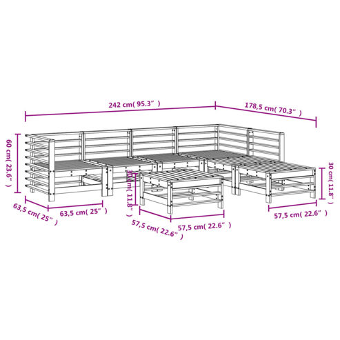 Dieses Garten-Lounge-Set aus Holz, das sich durch sein Latten-Design auszeichnet, ist eine großartige Bereicherung für deinen Garten, deine Terrasse oder deinen Balkon, um eine gemütliche Zeit mit der Familie oder Freunden zu verbringen. Massives Kiefernholz: Massives Kiefernholz ist ein wunderschönes Naturmaterial. Kiefernholz weist eine gerade Maserung auf und die Aststellen verleihen dem Material seine charakteristische, rustikale Optik.Bequemes Sitzerlebnis: Die Rückenlehne sorgt für zusätzlichen Sitzkomfort auf dem Gartensofa.Modulares Design: Die Sofagarnitur lässt sich flexibel und leicht umstellen und mit anderen modularen Elementen aus unserem Webshop frei kombinieren, um dein ganz persönliches Garten-Lounge-Set zusammenzustellen! Gut zu wissen:Damit deine Gartenmöbel lange schön bleiben, empfehlen wir dir, sie mit einer wasserdichten Hülle zu schützen.Die Kissen sind nicht im Lieferumfang enthalten. ** Material: Massives Kiefernholz (unbehandelt) ** Material der Latten: Sperrholz ** Abmessungen des Mittelsofas: 57,5 x 63,5 x 60 cm (L x B x H) ** Abmessungen des Gartenhockers/Couchtisches: 57,5 x 57,5 x 30 cm (L x B x H) ** Abmessungen des Ecksofas: 63,5 x 63,5 x 60 cm (L x B x H) ** Maximale Tragfähigkeit (pro Sitz ): 110 kg ** Zusammenbau erforderlich: Ja ** Lieferung umfasst: ** 3 x Sofa-Mittelteil ** 2 x Gartenhocker/Couchtisch ** 2 x Ecksofa Maximal 110 kg pro Sitzplatz.
