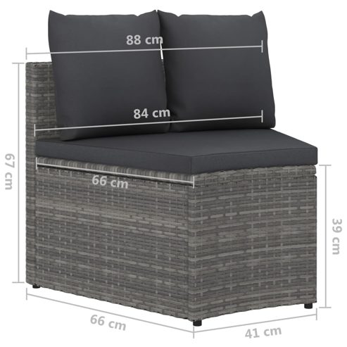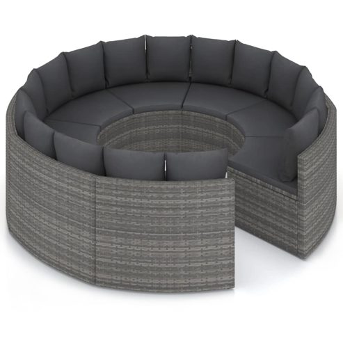 Schaffen Sie einen entspannenden Lounge-Bereich in Ihrem Garten mit diesem Lounge-Set aus Poly-Rattan. Diese gemütliche Garten-Sofagarnitur verfügt über einen pulverbeschichteten Stahlrahmen, der mit PE-Ratten überzogen ist, und ist daher robust und leicht zu reinigen. Die Sofateile bilden zusammen eine Fächerform und stellen eine perfekte Dekoration in Ihrem Außenbereich dar. Darüber hinaus bieten die dick gepolsterten Sitz- und Rückenkissen höchsten Sitzkomfort. Dank seiner Leichtbauweise lässt sich dieses Garten-Lounge-Set auch ganz einfach umstellen. Wichtiger Hinweis: Wir empfehlen, das Lounge-Set bei Regen, Schnee und Frost für eine lange Lebensdauer abzudecken. ** Farbe: Grau ** Polsterfarbe: Dunkelgrau ** Material: PE-Rattan, pulverbeschichteter Stahl, Stoff (100% Polyester) ** Abmessungen jedes Sofas: 88 x 66 x 67 cm (B x T x H) ** Sitzhöhe über dem Boden: 39 cm ** Sitzkissen-Dicke: 5 cm ** Fächerförmiges Design ** Mit verstellbaren Füße zum Nivellieren ** Zusammenbau erforderlich: Ja ** Lieferung enthält: ** 8 x Sofa ** 8 x Sitzpolster ** 16 x Rückenkissen