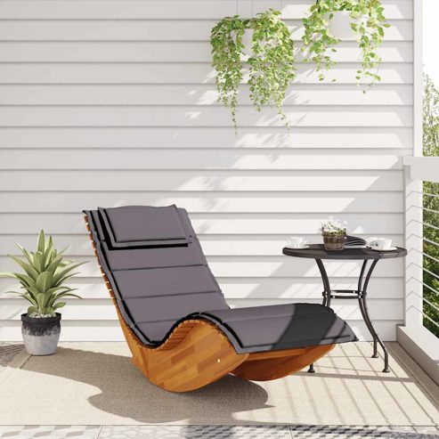 Diese Schaukelliege aus Holz eignet sich ideal zum Sonnenbaden und Entspannen in der Nähe des Pools, auf der Terrasse oder im Garten. Robust und stabil: Massives Akazienholz ist für seine Festigkeit und Haltbarkeit bekannt. Seine Farbtöne und einzigartige Maserung verleihen ihm eine attraktive Optik. Dank seiner ausgezeichneten Stabilität und Witterungsbeständigkeit eignet sich das Holz ideal für die Herstellung von Innen- und Außenmöbeln.Sicheres & beruhigendes Schaukeln: Du kannst auf dieser Gartenliege sanft hin und her schaukeln, um dich in deiner Freizeit zu entspannen. Die Bodenstopper verhindern, dass der Holz-Schaukelstuhl umkippt und bieten dir ein sicheres Schaukelerlebnis.Ergonomisches Design: Die Sonnenliege verfügt über eine ergonomisch geformte Liegefläche, die sich den Konturen deines Körpers anpasst, sodass du dich in aller Ruhe entspannen kannst.Gute Belüftung und Verhinderung von Ansammlungen: Das Latten-Design sorgt für eine optimale Luftzirkulation und verhindert effektiv, dass sich Wasser ansammelt, wodurch die Sitzfläche stets bequem trocken bleibt.Bequemes Sitzerlebnis: Dieser Gartensessel mit dick gepolsterten Kissen bietet ein angenehmes Sitzgefühl. Gut zu wissen:Wir empfehlen dir, deine Gartenmöbel mit einer wasserdichten Hülle zu schützen, um lange Zeit eine ansprechende Optik aufzuweisen. ** Sonnenliege: ** Material: Akazien-Massivholz, mit Öl behandelt ** Gesamtabmessungen: 154 x 60 x 74 cm (L x B x H) ** Sitzhöhe: 20/38 cm ** Max. Belastbarkeit: 110 kg ** Zusammenbau erforderlich: Ja ** Kissen: ** Farbe: Dunkelgrau ** Bezugsmaterial: Stoff (100% Polyester) ** Füllung: Schaumstoff ** Abmessungen: 185 x 60 x 3 cm (L x B x T) ** Abmessungen des Kopfkissens: 45,5 x 26,5 x 3 cm (L x B x T) ** Lieferung umfasst: ** 1 x Sonnenliege ** 1 x Sitzpolster ** 1 x Kopfkissen
