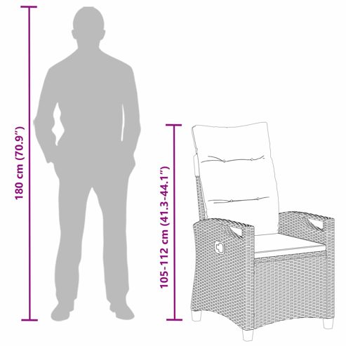 Dieser verstellbare Gartenstuhl ist die perfekte Mischung aus Style und Funktionalität für jeden Außenbereich. Mit seinem modernen Design und klaren Linien sticht er durch den schicken Rattan-Look hervor. Die Eleganz wird mit einem klappbaren Tisch kombiniert, der zusätzlichen Komfort bietet und ihn zur besten Wahl für entspanntes Sitzen im Garten macht. Seine gute Optik kommt auch durch die durchdachte verstellbare Rückenlehne, die individuellen Komfort garantiert. Materialien aus Polyester und Stahl: Der verstellbare Gartenstuhl ist aus Polyester und Stahl und sieht super aus, ist aber gleichzeitig langlebig. Diese Materialien sorgen dafür, dass er stark ist und dir ein sicheres Gefühl beim Sitzen gibt. Polyester trägt zum Komfort bei, während der pulverbeschichtete Stahl wetterfest ist – perfekt für draußen. Komponenten und Zubehör: Mit einem praktischen ausklappbaren Tisch hast du zusätzlichen Platz für Drinks, Bücher oder Snacks, was dein Entspannungserlebnis noch besser macht. Die flachen Armlehnen bieten Komfort beim Sitzen. Stabilität garantiert die robuste Konstruktion, sodass du sicher sitzen kannst. Funktionale verstellbare Eigenschaften: Der Stuhl hat eine verstellbare Rückenlehne, die dir hilft, die perfekte Position zu finden, und du kannst ihn in der Höhe von 87 cm bis 105 cm anpassen – so bleibst du flexibel! Empfohlene Nutzung im Freien: Ideal für sonnige Tage, schmückt der Stuhl jeden Garten oder jede Terrasse. Seine flexible und tragbare Art macht ihn perfekt für entspannte Alleinmomente oder wenn du Gäste hast. Er ist die vielseitige Wahl für alle Gartenmöbel-Liebhaber. Pflege und Wartung: Für die einfache Pflege wischst du den Stuhl einfach mit einem feuchten Tuch ab. So bleibt er immer in Topform und du kannst dich rundum wohlfühlen, während du auf ihm sitzt. ** Material: Stahl ** Gesamtabmessungen: 56 x 60 x 112 cm (L x B x H) ** Sitztiefe: 53,5 cm ** Sitzhöhe vom Boden: 44 cm ** Rückenhöhe: 68,5 cm ** Max. Gewicht: 110 kg pro Sitz ** Sitzplatzkapazität: 1 ** Montage erforderlich: Ja ** Lieferumfang: ** 1 x Liegestuhl für den Garten