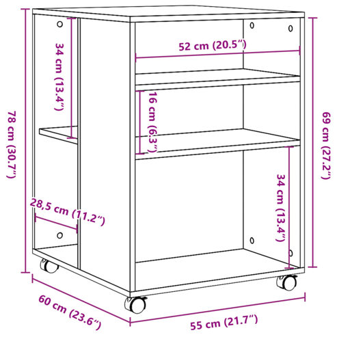 Mit seinem trendigen und dennoch praktischen Design ist dieser Beistelltisch ein echter Hingucker in jedem Zimmer.Starkes und langlebiges Material: Holzwerkstoff ist ein langlebiges und robustes Material mit einer glatten Oberfläche, das gegen Feuchtigkeit, Verformung und Rissbildung beständig ist, wodurch es eine zuverlässigen Wahl für die Herstellung von Möbeln ist.Viel Stauraum: Der Beistelltisch verfügt über zwei Ablagen und bietet dadurch reichlich Platz, um wichtige Sachen ordentlich und griffbereit aufzubewahren.Einfaches Umstellen: Dank der vier Schwenkrollen lässt sich der Beistelltisch mühelos an jeden gewünschten Ort bringen. Dabei sind zwei Rollen feststellbar, um den Tisch bei Bedarf an Ort und Stelle zu halten und für zusätzliche Stabilität zu sorgen.Pflegeleicht: Dank seiner glatten Oberfläche lässt sich der Beistelltisch mit einem Tuch leicht reinigen und erfordert wenig Pflege.Vielseitig einsetzbar: Mit seinem zeitlosen Design lässt sich der Beistelltisch je nach Bedarf im Wohnzimmer, in der Küche oder im Schlafzimmer einsetzen. ** Farbe: Braun Eichen-Optik ** Material: Holzwerkstoff ** Abmessungen der Ablagen: 28,5 x 55 x 34 cm (B x T x H) ** Abmessungen der kleinen Fächer: 52 x 28,5 x 16 cm (B x T x H) ** Abmessungen der großen Fächer: 52 x 28,5 x 34 cm (B x T x H) ** Gesamtabmessungen: 55 x 60 x 78 cm (B x T x H) ** Belastbarkeit (pro Boden): 11 kg ** Maximale Tragfähigkeit: 50 kg ** Anzahl der Rollen (um 360° drehbar): 4 (2 mit Bremsen) ** Befestigungsmaterial inklusive ** Zusammenbau erforderlich: Ja