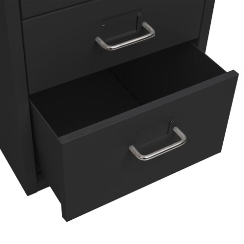 Dieser Büroschrank mit typischem Aktenschrank-Design eignet sich ideal zur Aktenaufbewahrung. Dieser Büroschrank ist aus Metall gefertigt, wodurch er langlebig und pflegeleicht ist. Der Aktenschrank verfügt über 6 Schubladen und Sie können Namensschilder in die Metallgriffe stecken, um Ihre Akten übersichtlich in verschiedene Kategorien einzusortieren. Mit 4 Rollen ausgestattet, lässt sich der Schrank auch leicht umher verschieben. Dank seines ikonischen Designs passt er zu jeder Büroeinrichtung. Zudem lässt sich der Schrank mit einem feuchten Tuch leicht reinigen. ** Farbe: Schwarz ** Material: Metall ** Abmessungen: 28 x 41 x 69 cm (B x T x H) ** 6 Schubladen ** Metallgriff ** Mit 4 Rädern ** Belastbarkeit pro Schublade: 5 kg ** Gesamte Belastbarkeit: 35 kg ** Zusammenbau erforderlich: Ja