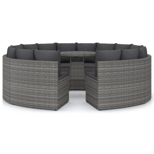 Schaffen Sie einen entspannenden Lounge-Bereich in Ihrem Garten mit diesem Lounge-Set aus Poly-Rattan. Diese gemütliche Garten-Sofagarnitur verfügt über einen pulverbeschichteten Stahlrahmen, der mit PE-Ratten überzogen ist, und ist daher robust und leicht zu reinigen. Die Sofateile bilden zusammen eine Fächerform und stellen eine perfekte Dekoration in Ihrem Außenbereich dar. Darüber hinaus bieten die dick gepolsterten Sitz- und Rückenkissen höchsten Sitzkomfort. Dank seiner Leichtbauweise lässt sich dieses Garten-Lounge-Set auch ganz einfach umstellen. Wichtiger Hinweis: Wir empfehlen, das Lounge-Set bei Regen, Schnee und Frost für eine lange Lebensdauer abzudecken. ** Tisch: ** Farbe: Grau ** Material: PE (Polyethylen) Rattan, pulverbeschichteter Stahl ** Abmessungen: 70 x 73 cm (Durchmesser x H) ** Sofa: ** Farbe: Grau ** Polsterfarbe: Dunkelgrau ** Material: PE-Rattan, pulverbeschichteter Stahl, Stoff (100% Polyester) ** Abmessungen: 88 x 66 x 67 cm (B x T x H) ** Sitzhöhe über dem Boden: 39 cm ** Sitzkissen-Dicke: 5 cm ** Fächerförmiges Design ** Mit verstellbaren Füße zum Nivellieren ** Zusammenbau erforderlich: Ja ** Lieferung enthält: ** 1 x Tisch ** 8 x Sofa ** 8 x Sitzpolster ** 16 x Rückenkissen