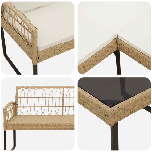 Dieses moderne Garten-Sofaset verwandelt dein Leben im Freien mit seinem klaren Design und der robusten Bauweise. Es bereichert deinen Garten, deine Terrasse und Poolbereiche – perfekt für entspannte Gespräche oder ruhige Abende im Freien. Mit seiner stilvollen und gleichzeitig funktionalen Silhouette ist es ein echter Hingucker in deiner Outdoor-Deko, egal ob beim Grillen oder unter dem Sternenhimmel. Robuste Bauweise: Das Sofaset aus Poly-Rattan und Stahl ist stabil und für den täglichen Einsatz im Freien gemacht. Diese wetterfeste Kombi sorgt dafür, dass die Möbel allen Wetterbedingungen trotzen und lange halten. Glasoberflächen: Der Tisch mit gehärteter Glasoberfläche bietet nicht nur eine schicke, sondern auch pflegeleichte Fläche für Speisen oder Deko. Das Glas ist sicher verarbeitet, um Stöße und Verschüttungen zu vermeiden und vereint Funktionalität mit Stil für deine Outdoor-Veranstaltungen. Poliesterkissen: Mit den weichen, wetterfesten Polyesterkissen bietet dieses Set hervorragenden Komfort und hält mehrere Saisons lang. Die Kissen sind schimmelresistent und verblassen nicht, sodass du lange Freude daran hast. Flexible Anordnung: Das modulare Design ermöglicht dir, das Set nach deinen Wünschen anzuordnen, egal ob für intime Gespräche oder große Feiern. Die L-Form nutzt den Platz optimal aus und schafft Flexibilität im Außenbereich. Pflegehinweise: Mit abnehmbaren Kissenbezügen ist die Reinigung ein Kinderspiel und hält deine Möbel frisch. Wische die Metall- und Glasoberflächen regelmäßig mit einem milden Reiniger ab, damit sie auch in Zukunft toll aussehen. ** Farbe: Natur ** Material: Polyrattan und Stahl ** Gewicht: 27,6 kg ** Gesamtabmessungen: 172 x 172 x 74 cm (L x B x H) ** Stoffzusammensetzung: Polyester ** Mit Kissen ** Sitzbreite: 110 cm ** Sitztiefe: 53 cm ** Sitzhöhe vom Boden: 40 cm ** Armlehnenhöhe vom Sitz aus: 17 cm ** Rückenhöhe: 36 cm ** Max. Gewicht: 110 kg pro Sitz ** Sitzplatzkapazität: 5 ** Wetterbeständig ** UV-beständig ** Langlebig ** Leicht zu reinigen ** Abnehmbarer Bezug für das Sitzkissen, einfach zu reinigen ** Nur für den Außenbereich ** Montage erforderlich: Ja ** Lieferumfang: ** 1 x Tisch: 53 x 53 x 40 cm (L x B x H) ** 1 x L-förmiges Sofa: 172 x 172 x 74 cm (L x B x H) ** 2 x Sitzkissen: 110 x 53 x 3 cm (L x B x T) ** 1 x Sitzkissen: 53 x 53 x 3 cm (L x B x T) ** 6 x Rückenpolster: 40 x 40 cm (L x B)
