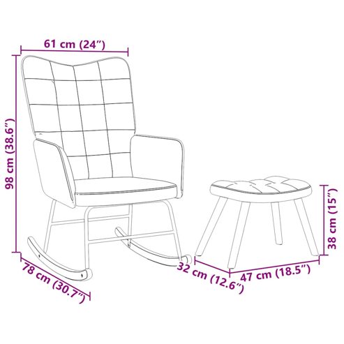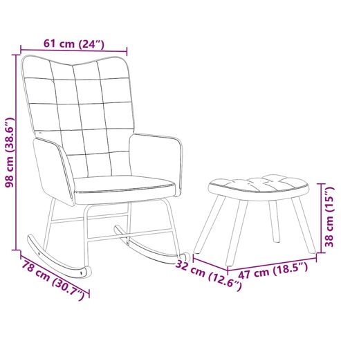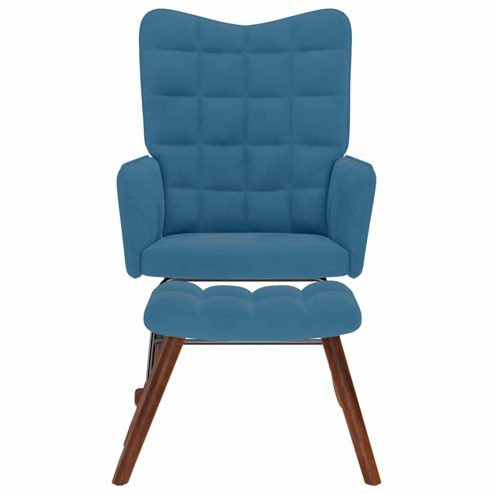 Auf der Suche nach einem Stuhl, auf dem du dich nach einem anstrengenden Tag komplett ausruhen kannst? Dieser bequeme Schaukelsessel mit Hocker ist die perfekte Wahl! Weiches und komfortables Material: Der Samtstoff hat eine weiche und sanfte Oberfläche, die sich angenehm auf der Haut anfühlt und höchsten Komfort bietet.Robustes und stabiles Gestell: Das Gestell aus Metall und Sperrholz sorgt für Robustheit und Stabilität.Komfortables Sitzgefühl: Der Sessel kommt mit der dick gepolsterten Sitz- und Rückenlehne sowie Armlehnen für hohen Komfort.Holzfüße: Die Holzfüße sorgen für eine hervorragende Stabilität und verleihen dem Stuhl ein natürliches und angenehmes Aussehen. Mit dem Design der langen Schaukelschienen kippt der Sessel nicht so leicht um.Vielseitiger Fußhocker: Der Hocker ist vielseitig einsetzbar und dient als bequeme Fußstütze, wenn Sie sich auf dem Stuhl zurücklehnen, oder als zusätzlicher Sitz.Breite Anwendungen: Dieser Loungesessel ist eine vielseitige und stilvolle Ergänzung für jeden Freizeitbereich zu Hause oder im Büro. Egal, ob Sie es in der Nähe des Wohnzimmersofas platzieren oder eine gemütliche Ecke in Ihrem Schlafzimmer oder Arbeitszimmer schaffen, es wird die Ästhetik Ihres Wohnraums aufwerten. ** Farbe: Blau ** Material: Samt (100% Polyester), Vollgummiholz, Sperrholz, Metall ** Füllung: Schaumstoff ** Stuhl-Maße: 61 x 78 x 98 cm (B x T x H) ** Hocker-Maße: 47 x 32 x 38 cm (B x T x H) ** Sitzbreite: 47 cm ** Sitztiefe: 53,5 cm ** Sitzhöhe über dem Boden: 47,5 cm ** Armlehnenhöhe vom Boden: 60,5 cm ** Flauschig und prall ** Zusammenbau erforderlich: Ja ** Lieferung umfasst: ** 1 x Relaxsessel ** 1 x Hocker