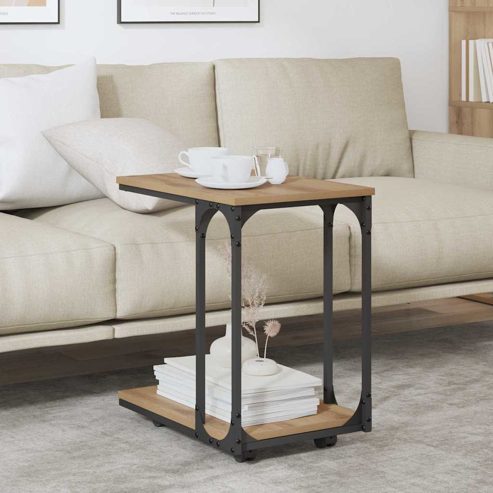 Der C-förmige Beistelltisch mit Rollen bringt rustikalen Flair in dein Wohnzimmer. Er ist sowohl praktisch als auch stylisch. Die warme Oberfläche und die kompakte Größe sind perfekt für kleine Räume, wo jeder Zentimeter zählt. Mit den verstellbaren Rollen lässt er sich leicht bewegen und bietet Platz für Drinks, Lampen oder Deko. Der Metallrahmen und die Holzwerkstoff-Oberfläche sorgen für Langlebigkeit und Qualität ohne Abstriche in der Optik. Materialzusammensetzung: Der Tisch hat eine klassische Holzwerkstoff-Oberfläche und einen robusten, pulverbeschichteten Metallrahmen. Diese Kombination sorgt für Stabilität und einen anhaltenden Charme und die matte Oberfläche passt gut zu rustikalen Einrichtungsstilen. Hochwertige Materialien stellen sicher, dass er dem täglichen Gebrauch standhält und sein elegantes Aussehen über Jahre behält. Integrierte Stauraumlösungen: Mit den Brett-Regalen bietet der Tisch praktischen Stauraum, der für Ordnung sorgt und den Nutzen maximiert. Dort finden Bücher, Zeitschriften oder Dekoartikel Platz – Stil und Bequemlichkeit vereint, was das Gesamtbild deines Wohnraums aufwertet. Robuste Bauweise: Der stabile Metallrahmen gibt dem Tisch die nötige Festigkeit. Die Pulverbeschichtung schützt und sieht gleichzeitig gut aus, harmoniert perfekt mit der Holzfläche. Das durchdachte Design ist ideal für den intensiven Gebrauch in gemütlichen und belebten Haushalten. Multifunktionales Design: Das C-förmige Design und die Rollen setzen Akzente und erfüllen viele Bedürfnisse. Perfekt, um dein Lieblingsgetränk neben dem Sessel oder als Begleiter zur Couch zu platzieren – du hast immer alles griffbereit. Pflegehinweise: Um Glanz und Langlebigkeit zu erhalten, einfach mit einem feuchten Tuch abwischen. Vermeide scharfe Chemikalien oder Scheuermittel, um die Oberfläche zu schonen, damit dieser Tisch ein schicker Teil deines Raumes bleibt. ** Farbe: Artisan-Eiche ** Material: Holzwerkstoff ** Gesamtabmessungen: 50 x 35 x 55,5 cm (L x B x H) ** Gewicht: 5 kg ** Stauraum ** Langlebig ** mit 1 Regal ** mit 4 Rädern ** Rahmenmaterial: Metall ** Drinnen & Draußen: Nur für den Innenbereich ** Lieferumfang: ** 1 x beistelltisch ** Montage erforderlich: Ja