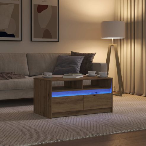 Dieser moderne Couchtisch hat ein stylisches, rechteckiges Design, das perfekt in ein zeitgemäßes Wohnzimmer passt. Mit einem raffinierten Touch funktioniert er nicht nur als funktionales Möbelstück, sondern gibt deinem Raum auch einen eleganten Look. Die Beleuchtung sorgt für warmes Licht und schafft eine einladende Atmosphäre – sowohl für kleine Zusammenkünfte als auch für den Alltag. Der Holzwerkstoffrahmen bietet dir Sicherheit und Langlebigkeit. LED-Akzentbeleuchtung Flexible LED-Streifen sorgen für angenehmes Licht und bringen Atmosphäre in dein Zuhause. Sie setzen besondere Deko-Elemente oder architektonische Details perfekt in Szene und verleihen deinem Raum Tiefe und visuelles Interesse. Langlebiger Holzwerkstoff Dieser Tisch besteht aus robustem Holzwerkstoff, was für hohe Stabilität sorgt. Das Material hält dem täglichen Gebrauch stand und bleibt dabei stylish, also eine clevere langfristige Investition. Praktische Aufbewahrungsschublade Mit seiner sanft gleitenden Schublade bietet dieser Tisch genug Platz für Zeitschriften, Fernbedienungen und andere Utensilien und hält dein Zimmer ordentlich. Rechteckige Form Die große Tischplatte von 90 x 50 cm bietet genug Fläche für alles – sei es die Begrüßung von Gästen oder entspannte Momente. Das flache Design passt ideal ins Wohnzimmer und lässt dir die Freiheit für verschiedene Anordnungen. Pflegeleichte Oberfläche Um das frische Aussehen des Tisches zu erhalten, einfach trocken reinigen und aggressive Chemikalien vermeiden. Diese einfache Pflege sorgt dafür, dass der Tisch ein Blickfang in deinem Zuhause bleibt. ** Farbe: Kunsthandwerk Eiche ** Material: Holzwerkstoff ** Gesamtabmessungen: 90 x 50 x 45 cm (L x B x H) ** mit 2 Schubladen ** Anzahl Staufächer: 2 ** Lichttyp: LED-Streifen ** Langlebig ** Nur für den Innenbereich ** Montage erforderlich: Ja ** Lieferumfang: ** 1 x Couchtisch Bitte beachten Sie, dass Sie ausschließlich eine zertifizierte 5-V-Gleichstromversorgung verwenden dürfen. Höhere Spannungen können zu Überhitzung und Schäden am Gerät sowie zu Brandgefahr führen. Schließen Sie dieses Produkt nur an die im Handbuch, auf dem Typenschild oder von vidaXL angegebene Stromversorgung an. Dieses Gerät ist nicht für Kinder unter 14 Jahren und Personen mit eingeschränkten physischen, sensorischen oder geistigen Fähigkeiten oder mangelnder Erfahrung im Umgang mit elektronischen Geräten geeignet. Elektrizität ist gefährlich. Beschädigungen, unsachgemäße Installation, Verwendung oder Veränderungen (Austausch einzelner Komponenten) können zu Schäden am Gerät, Stromschlägen und Gefahren für den Benutzer führen. Betreiben Sie dieses Produkt nicht in explosionsgefährdeten Bereichen, z. B. in der Nähe von brennbaren Flüssigkeiten, Gasen und Stäuben oder bei Temperaturen über 50 °C. Schalten Sie das Produkt nicht ein, wenn das Anschlusskabel oder das Netzteil sichtbar beschädigt ist. Beschädigte externe flexible Kabel oder Leitungen dieser Leuchte dürfen nur vom Hersteller, dessen Servicepartner oder einer entsprechend qualifizierten Fachkraft ausgetauscht werden, um Gefahren zu vermeiden. Schalten Sie die Stromzufuhr während der Installation und Wartung ab. Stellen Sie sicher, dass die Leuchtmittel abgekühlt sind. Das Leuchtmittel dieser Leuchte ist nicht austauschbar; wenn das Leuchtmittel seine Lebensdauer erreicht hat, muss die gesamte Leuchte ersetzt werden. Nur für den Innenbereich geeignet, nicht im Freien verwenden. Das Produkt verfügt über einen USB-Anschluss, das zertifizierte 5-V-USB-Netzteil ist jedoch nicht im Lieferumfang enthalten.
